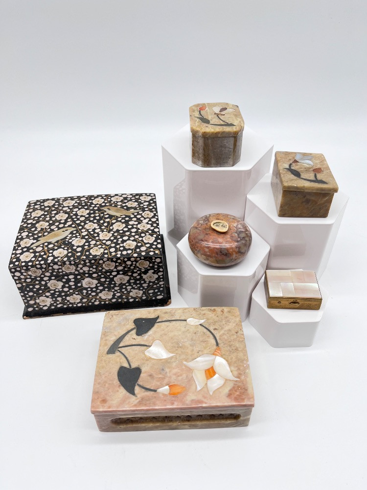 Lot # 184 - Hand-Painted Box, Chinese Hand Painted Egg, & 2 Polished Stone Eggs Starting Bid: $ 5.00 Bids: This sale will end in: |