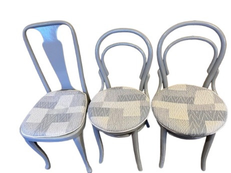 Lot # 20 - Set of 3 Bentwood Chairs – Painted Gray w/ Upholstered Seats Starting Bid: $ 5.00 Bids: This sale will end in: |