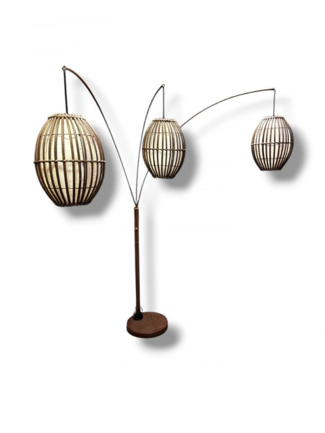 Lot # 107 - Vintage Tiki Bamboo Arc Floor Lamp – 3 Shade Copper Finish, Tested Starting Bid: $ 5.00 Bids: This sale will end in: |