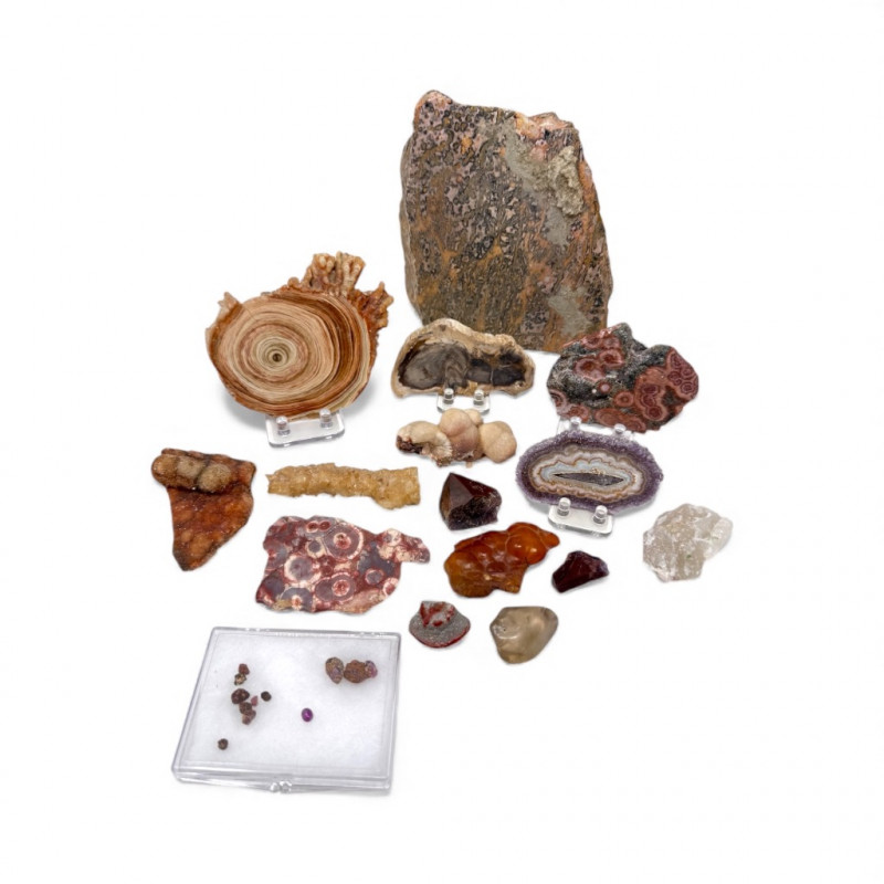 Lot # 77 - Mixed Mineral Lot w/ Agate Slices, Thomsonite, Calcite & More Starting Bid: $ 5.00 Bids: This sale will end in: |