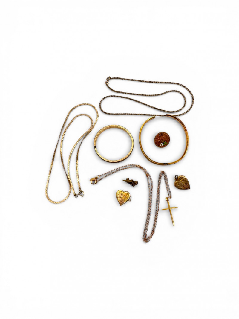 Lot # 39 - Mixed Gold Filled Jewelry - Chains, Bangle, Cross, Locket, 22.79g Starting Bid: $ 5.00 Bids: This sale will end in: |
