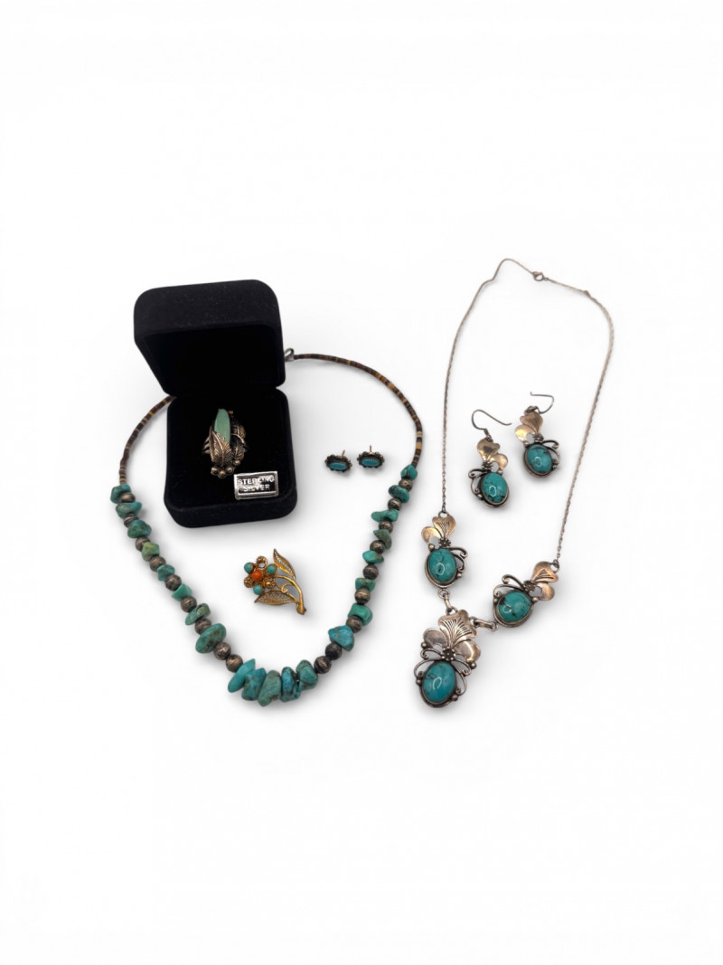 Lot # 41 - Sterling Silver Turquoise & Coral Jewelry – Necklace, Ring, Earrings Starting Bid: $ 5.00 Bids: This sale will end in: |