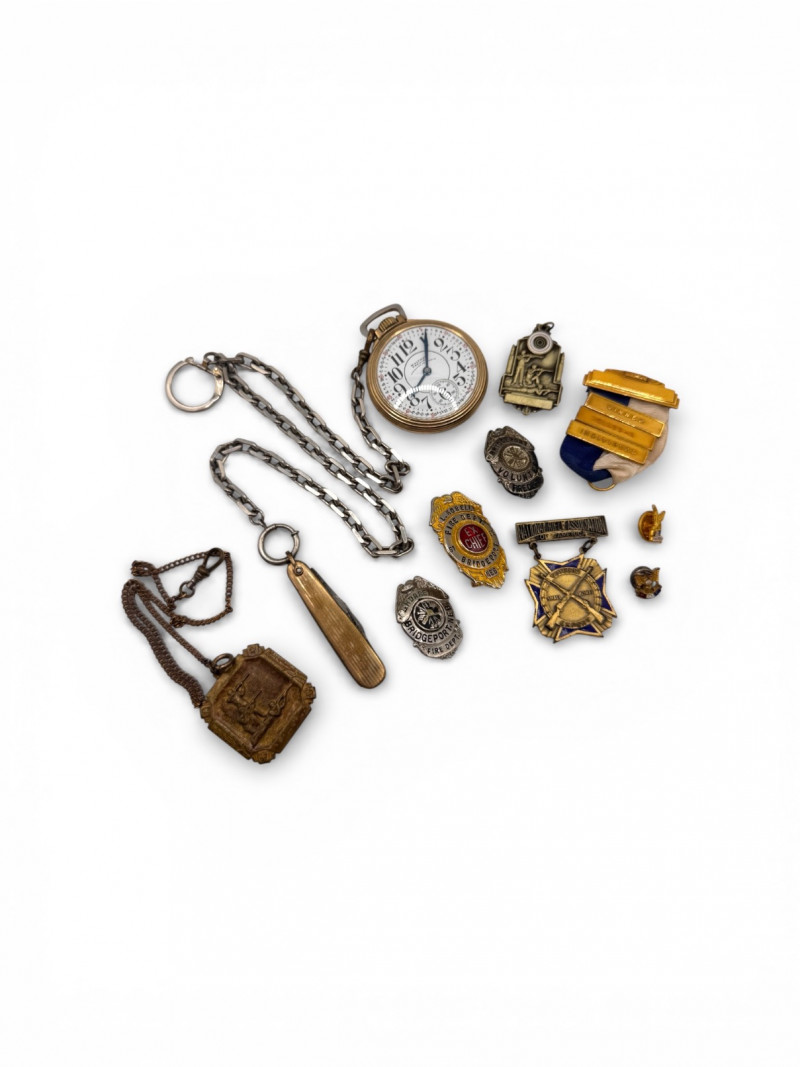 Lot # 54 - Vintage Waltham large Pocket Watch & Fraternal / Fire Dept Badges Starting Bid: $ 5.00 Bids: This sale will end in: |