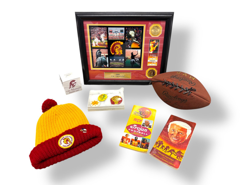 Lot # 67 - USC Trojans Collection: Football, Guides, Pins, Beanie, Framed Art Starting Bid: $ 5.00 Bids: Bidding starts in: |