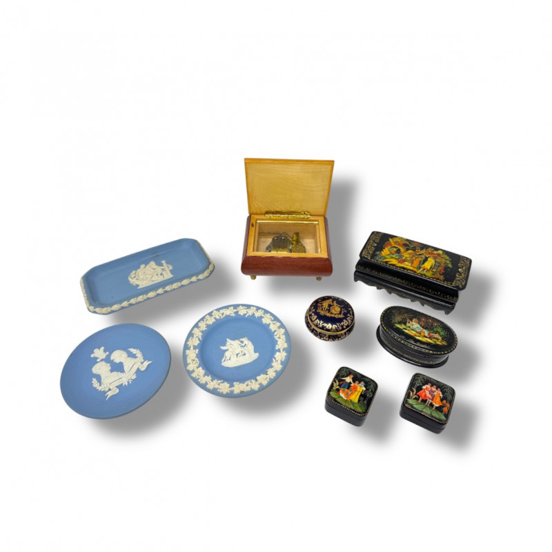 Lot # 125 - Wedgwood Jasperware Plates, Music Box & Russian Lacquer Trinket Boxes Starting Bid: $ 5.00 Bids: Bidding starts in: |