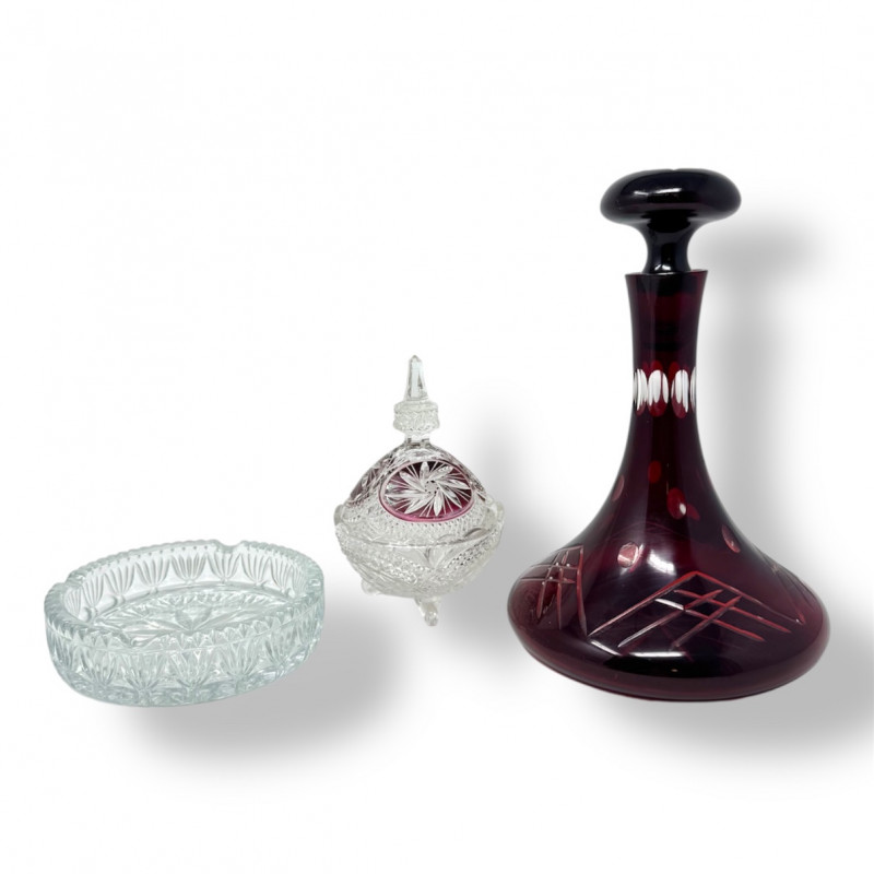 Lot # 126 - Ruby Red Cut-To-Clear Decanter, Crystal Candy Dish, & Ashtray Starting Bid: $ 5.00 Bids: Bidding starts in: |