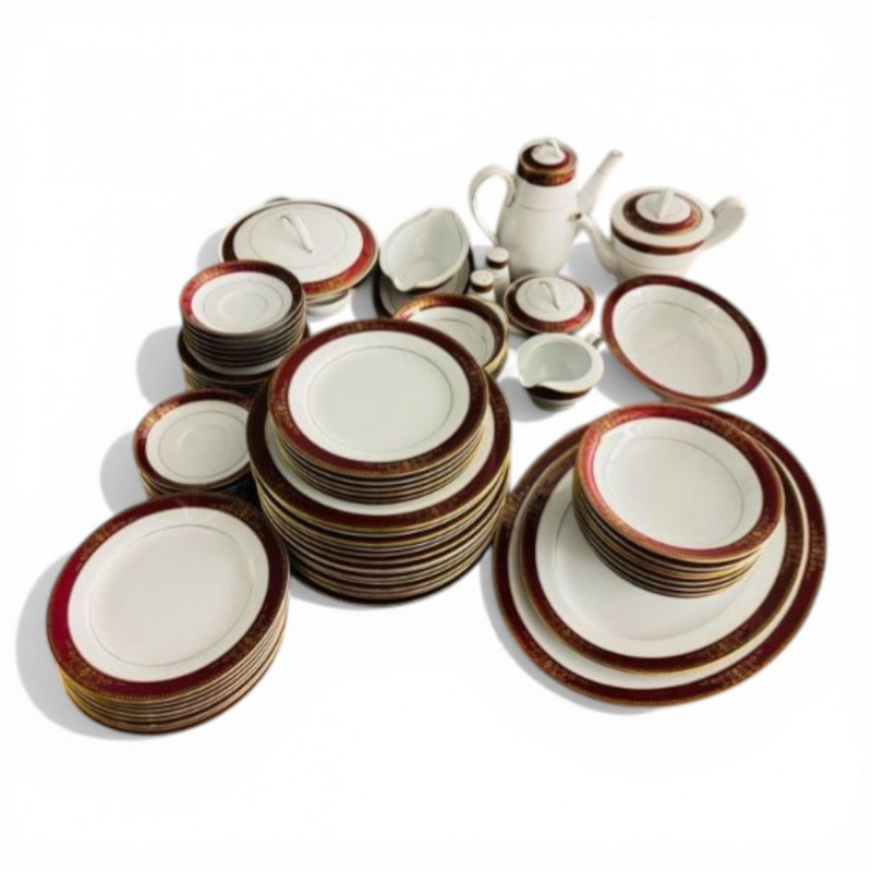 Lot # 154 - Noritake “Goldmere” Red/Gold Band China Set, Japan - 77pc Starting Bid: $ 5.00 Bids: Bidding starts in: |