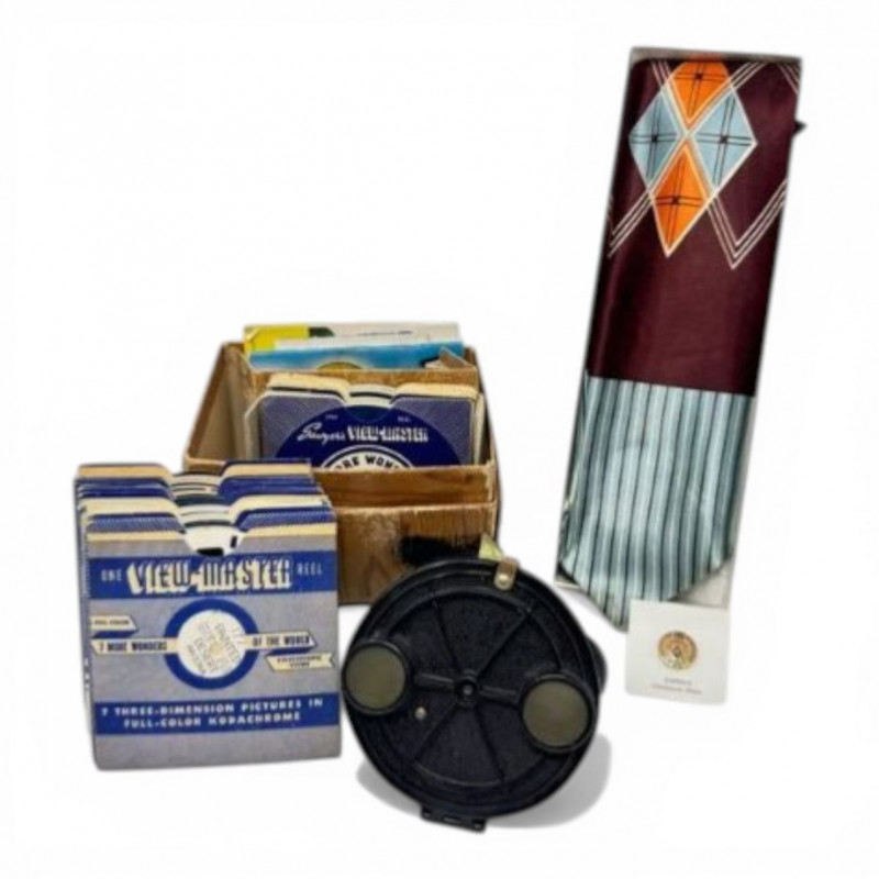 Lot # 158 - Vintage View-Master Reels Viewer, Wide Necktie & 10 Year Jostens Pin Starting Bid: $ 5.00 Bids: Bidding starts in: |