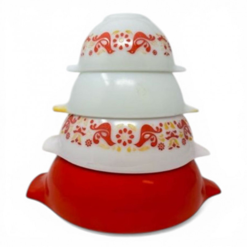 Lot # 161 - Set of 4 Pyrex Mixing Bowls - Friendship Pattern, Milk Glass, & Red Starting Bid: $ 5.00 Bids: Bidding starts in: |