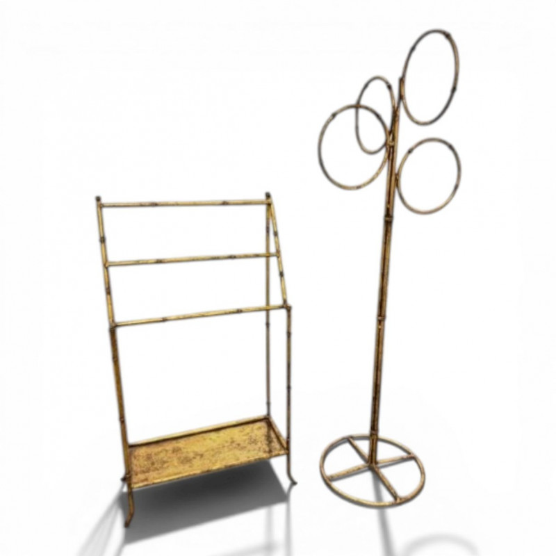 Lot # 168 - Vintage Hollywood Regency METAL Faux Bamboo Rack & 4-Ring Towel Stand Starting Bid: $ 5.00 Bids: Bidding starts in: |