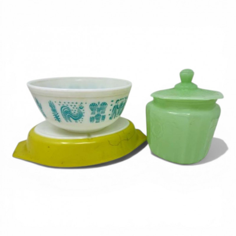 Lot # 173 - Vintage Pyrex Butterprint Bowl, Lime Pyrex Dish & Jadeite Jar Starting Bid: $ 5.00 Bids: Bidding starts in: |
