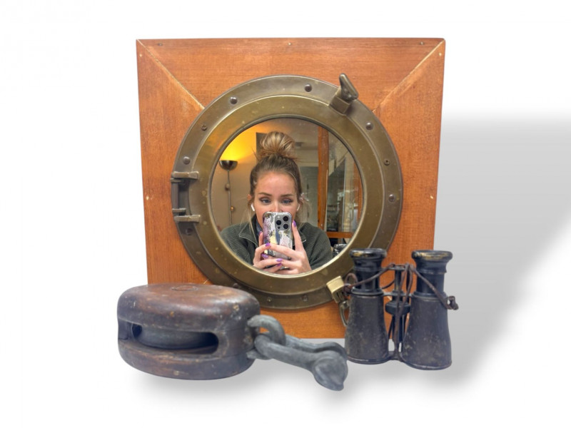 Lot # 58 - Vintage Porthole Wall Shelf w/ Antique Binoculars & Pulley Block Starting Bid: $ 5.00 Bids: This sale will end in: |