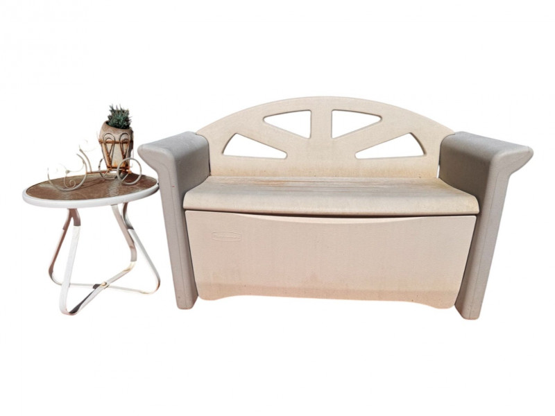 Lot # 108 - Rubbermaid Outdoor Storage Bench w/ Side Table & Metal Bicycle Decor Starting Bid: $ 5.00 Bids: This sale will end in: |