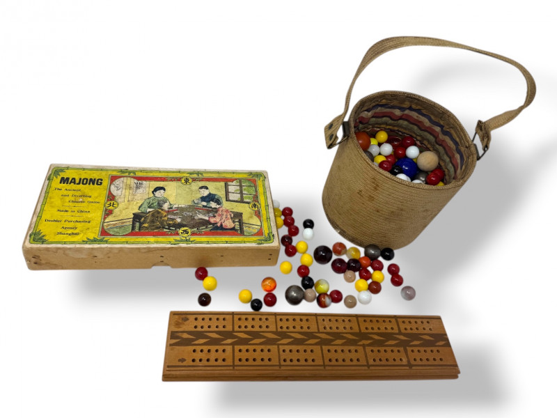 Lot # 30 - Vintage Mahjong Bone Tile Set, Cribbage Board & Vintage Marbles Basket Starting Bid: $ 5.00 Bids: Bidding starts in: |