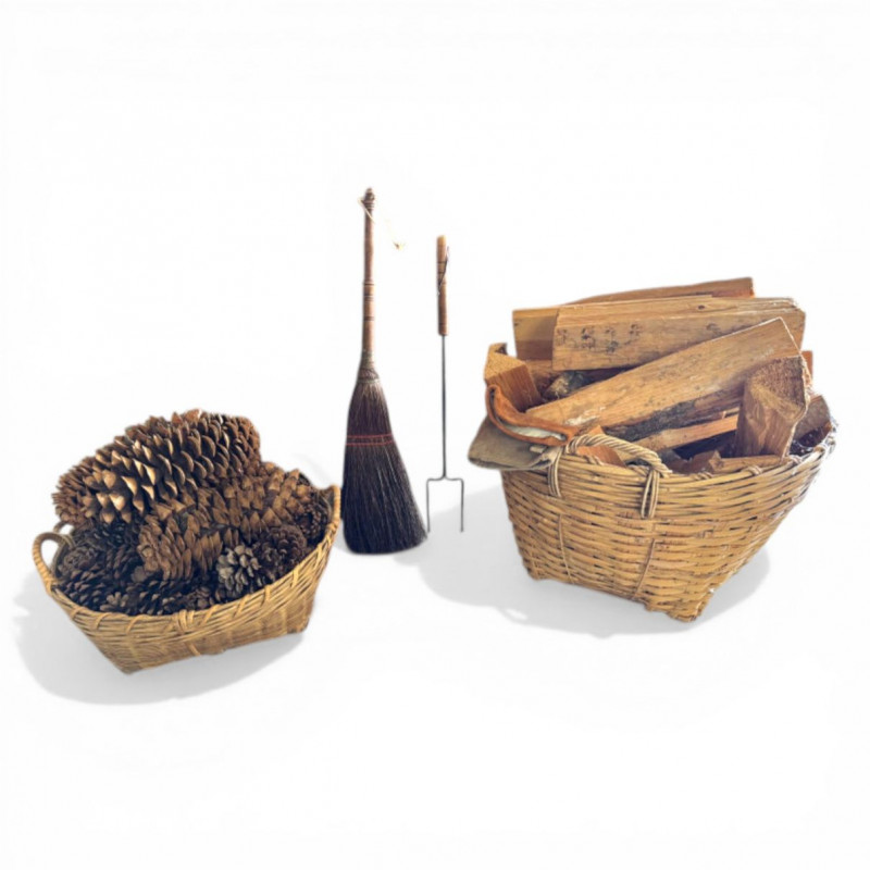 Lot # 57 - Firewood & Pinecone Set – Wicker Baskets, Kindling & Hearth Tools Starting Bid: $ 5.00 Bids: Bidding starts in: |