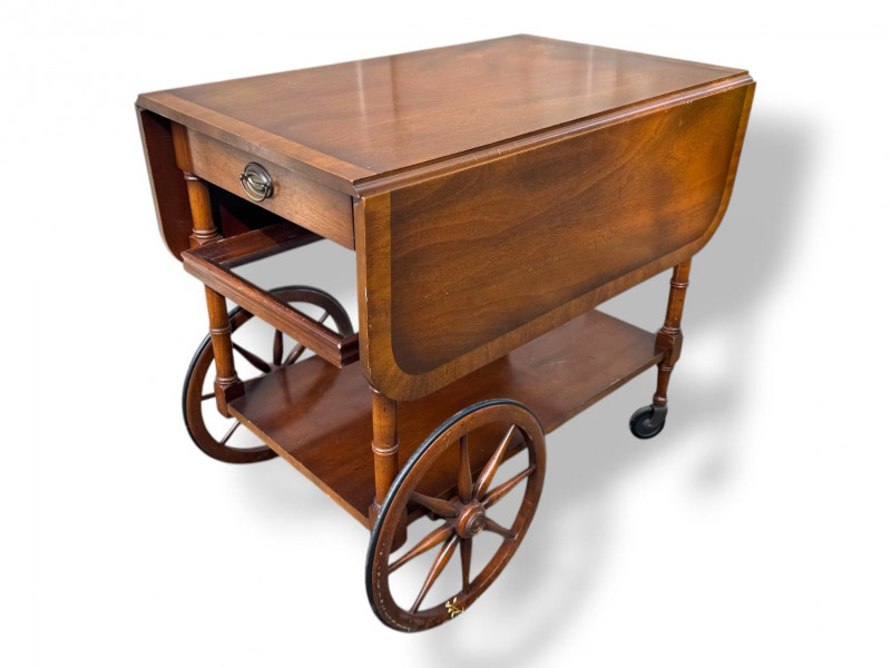 Lot # 177 - Vintage Genuine Mahogany Drop Leaf Tea Cart w/ Drawer & Wheels Starting Bid: $ 5.00 Bids: Bidding starts in: |