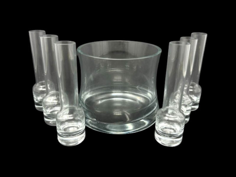 Lot # 142 - Glass Ice Bucket w/ Six Tall Shot Glasses Insert Starting Bid: $ 5.00 Bids: Bidding starts in: |