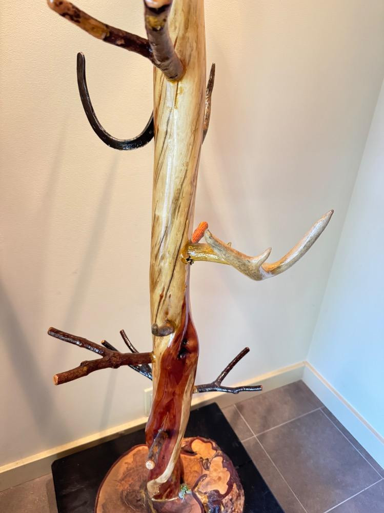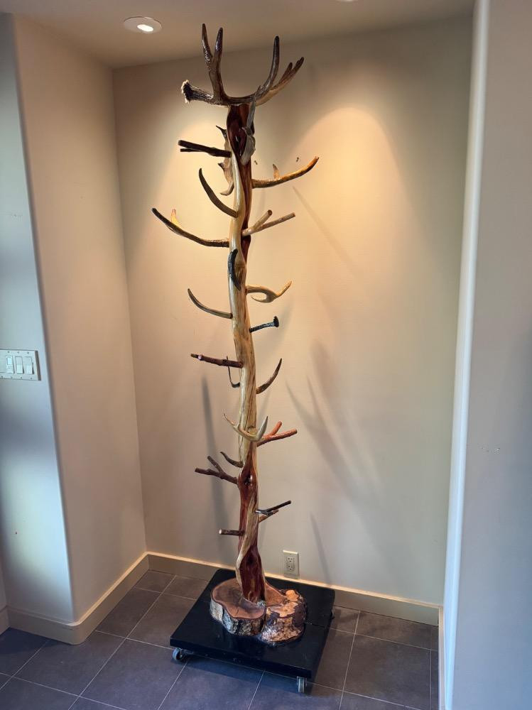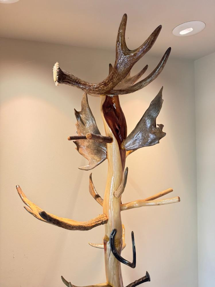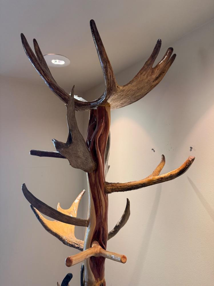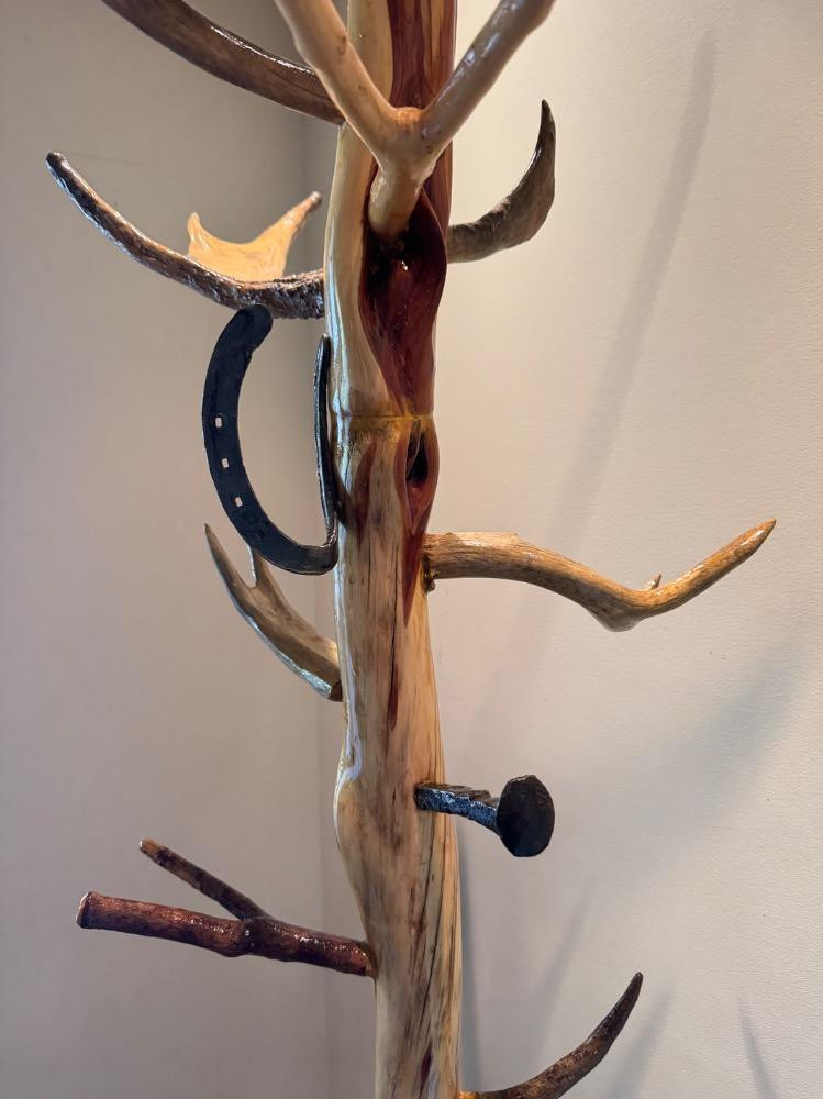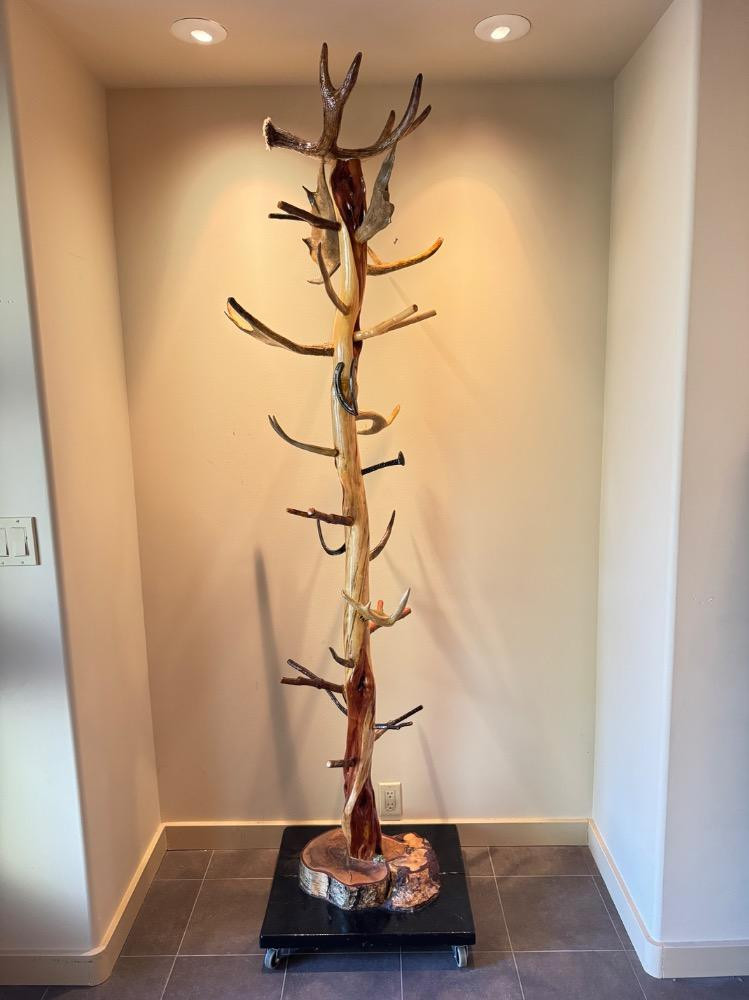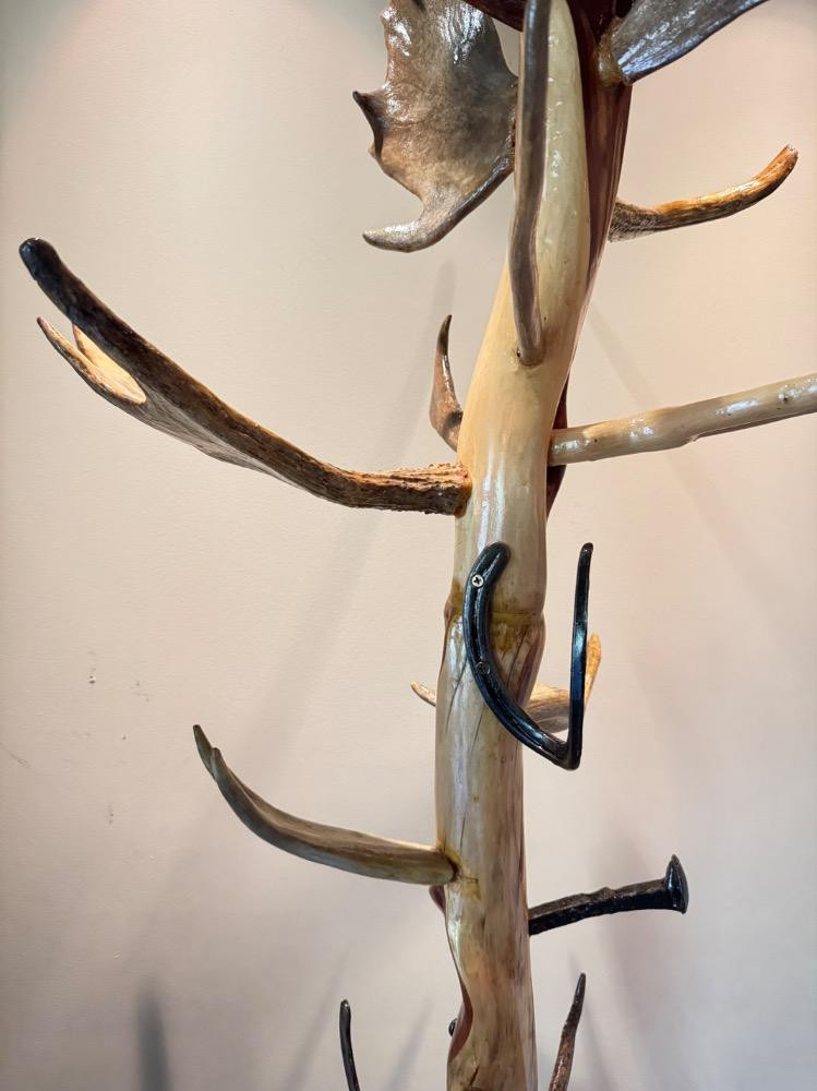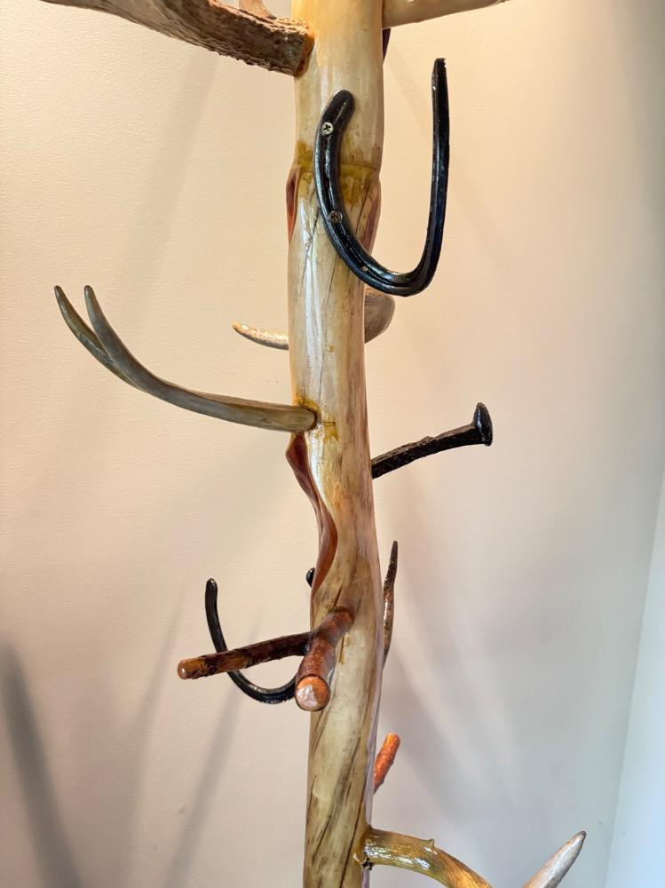 Unique Antler Coat Rack w/ Railroad Nails, Horseshoes, & Rolling Base. Base is 23” Wide 18” Deep 87” Tall Bidding on this lot is an agreement that: (1.) You will have 2 capable, able bodied persons to lift and load at a minimum. (2.) You will bring a hand truck and/or any other tools needed to remove this item. If these steps are not followed your item will be forfeit and no refund given.