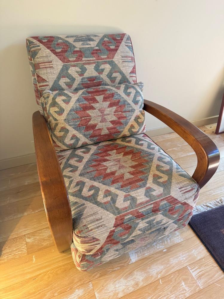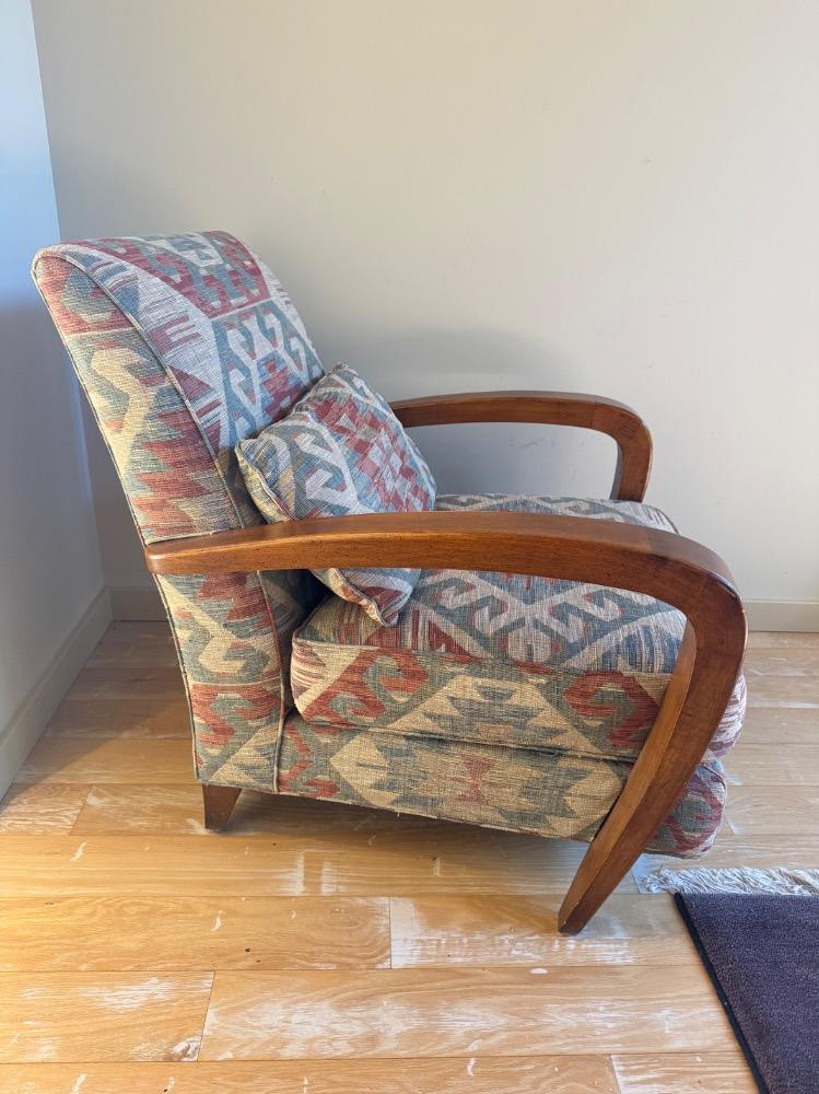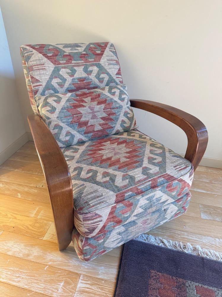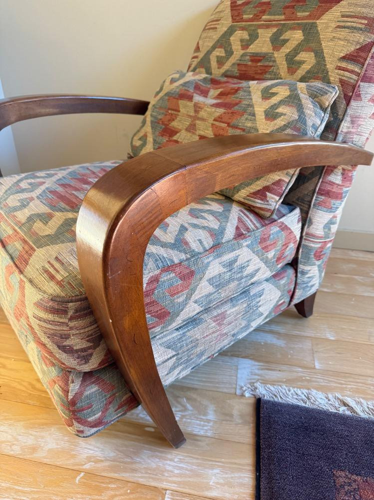 Henredon Wood Armchair – Southwestern Upholstery, Classic Design. Note: Minor Snags & Light Wear On The Fabric, Consistent w/ Gentle Use. 32.5” Wide 32” Deep, Seat Height 17” Tall Seat Back 36” Tall Bidding on this lot is an agreement that: (1.) You will have 2 capable, able bodied persons to lift and load at a minimum. (2.) You will bring a hand truck and/or any other tools needed to remove this item. If these steps are not followed your item will be forfeit and no refund given.