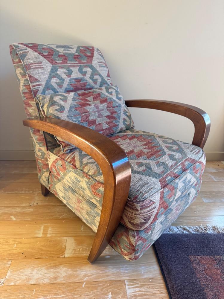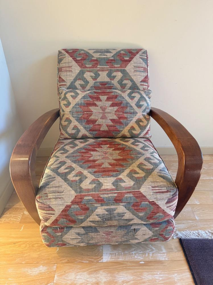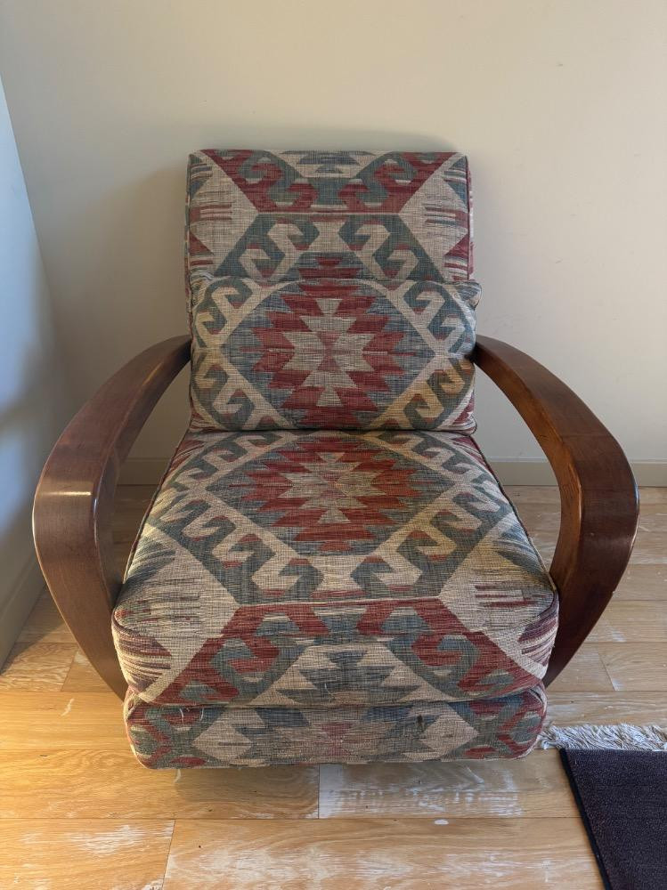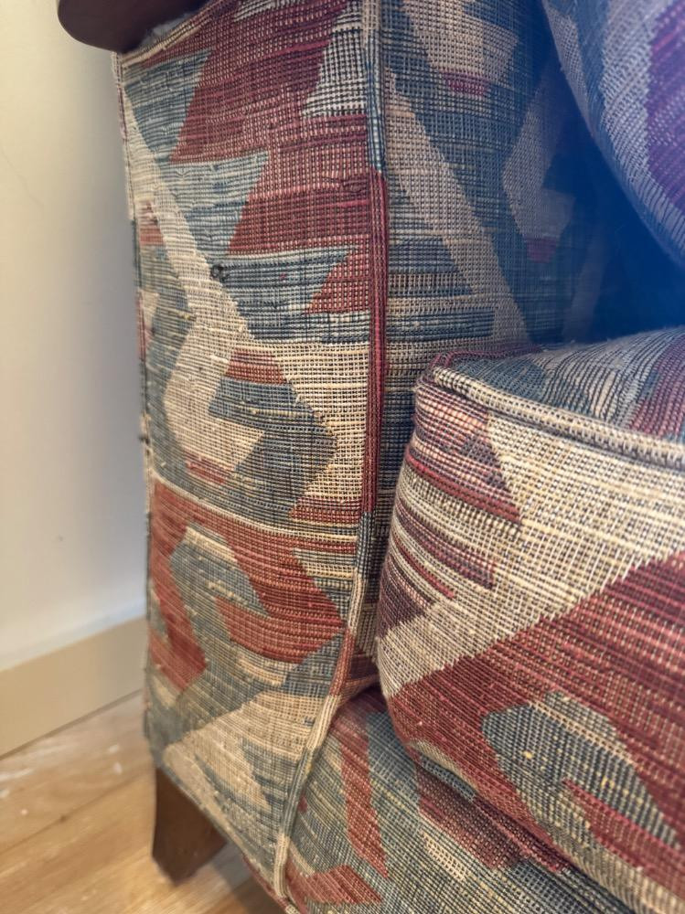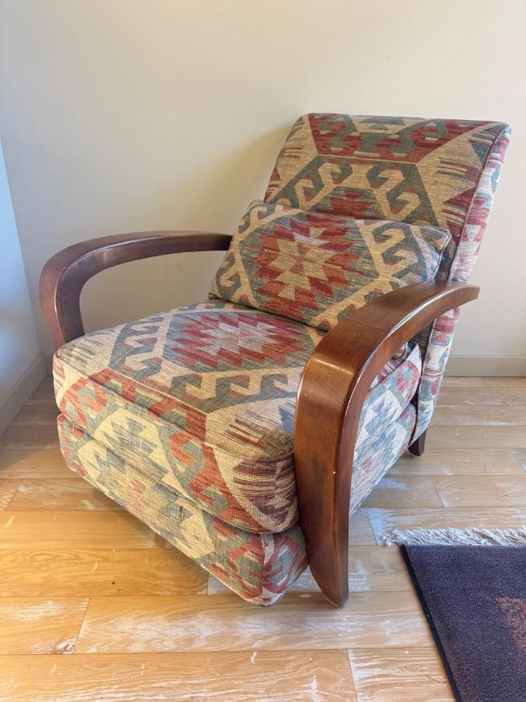Henredon Wood Armchair – Southwestern Upholstery, Classic Design. Note: Minor Snags & Light Wear On The Fabric, Consistent w/ Gentle Use. 32.5” Wide 32” Deep, Seat Height 17” Tall Seat Back 36” Tall Bidding on this lot is an agreement that: (1.) You will have 2 capable, able bodied persons to lift and load at a minimum. (2.) You will bring a hand truck and/or any other tools needed to remove this item. If these steps are not followed your item will be forfeit and no refund given.