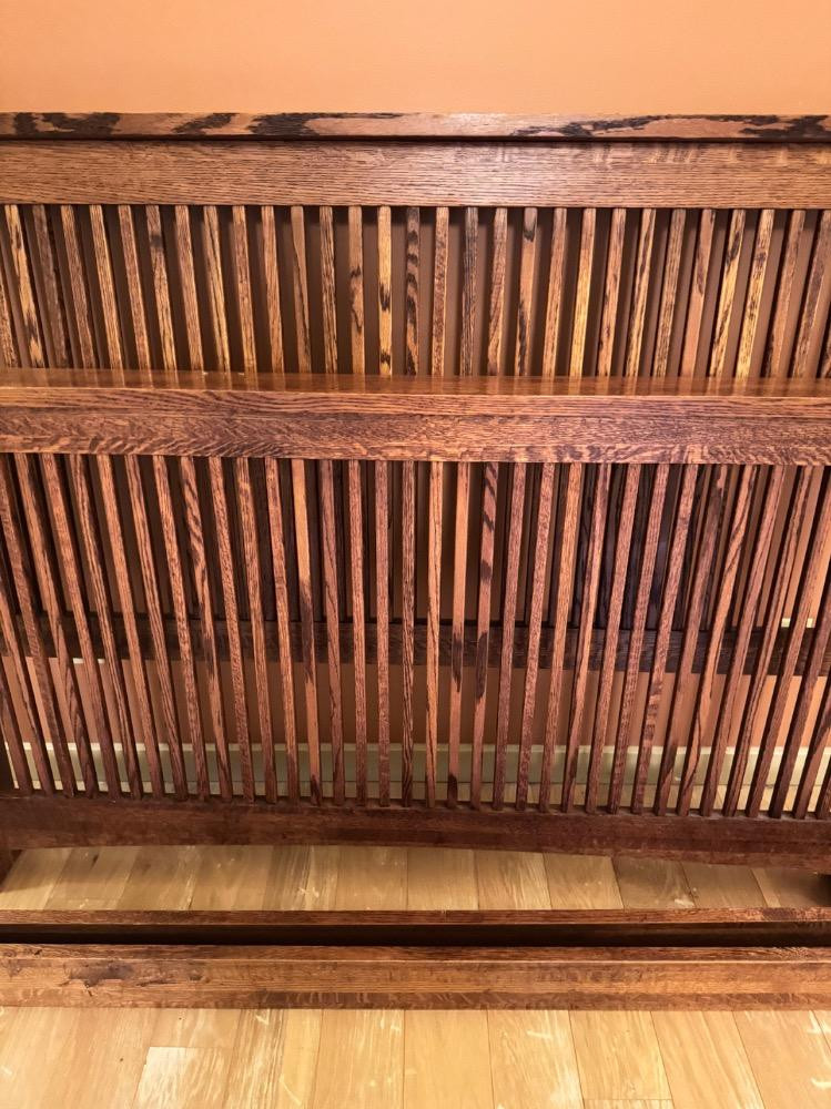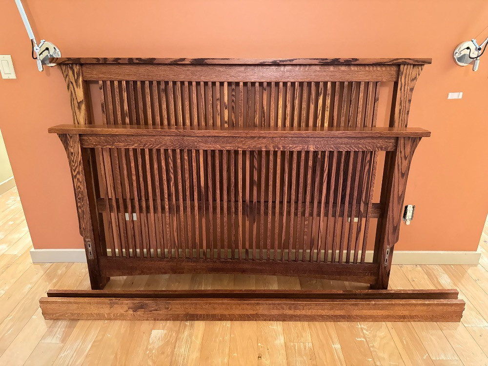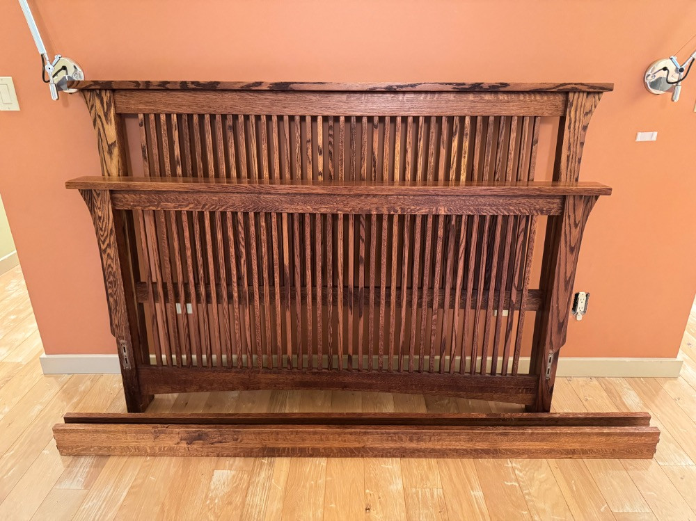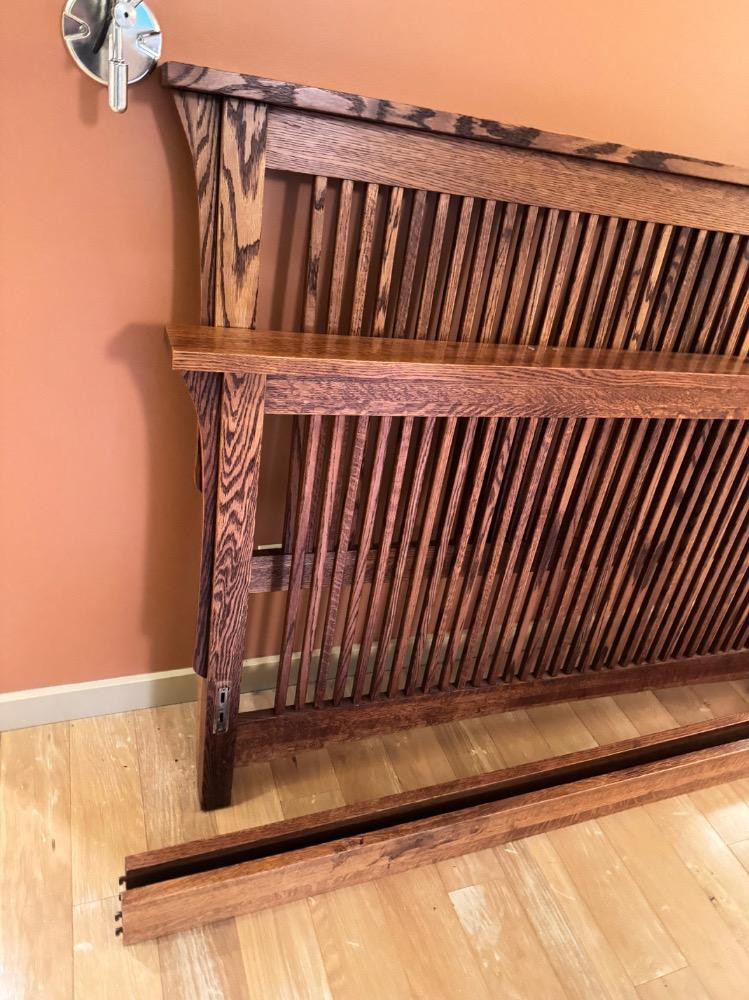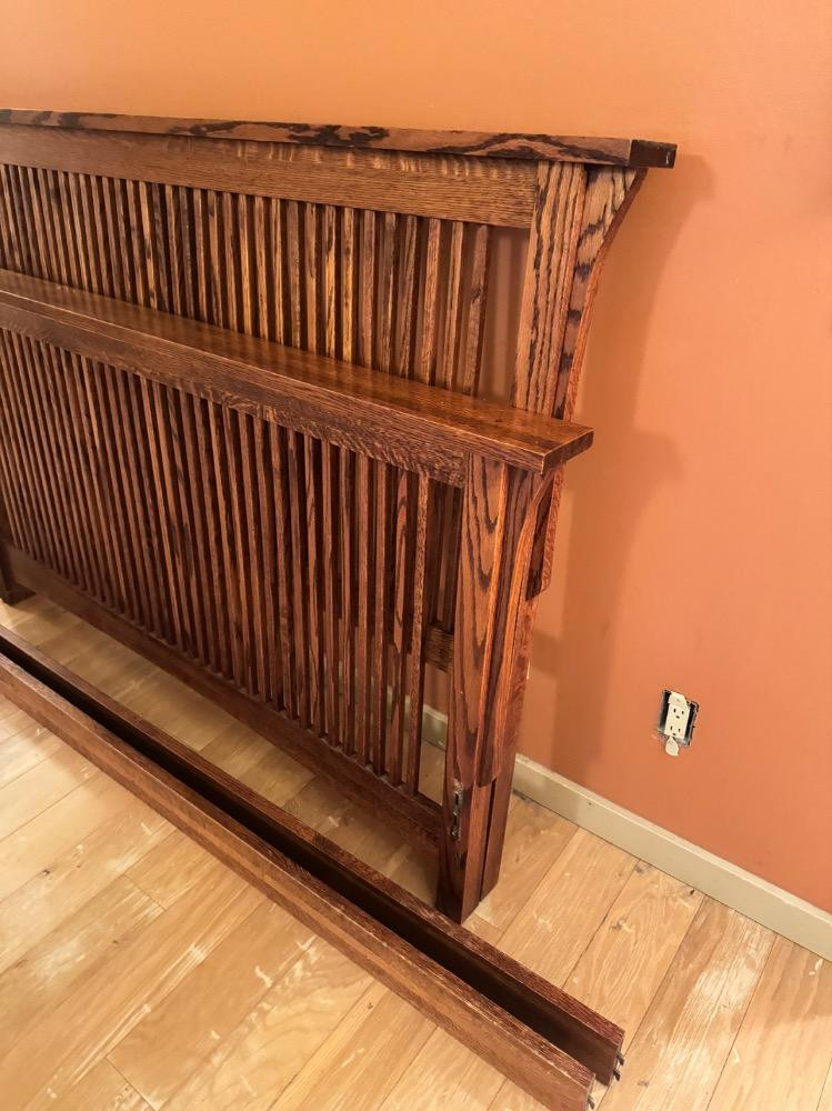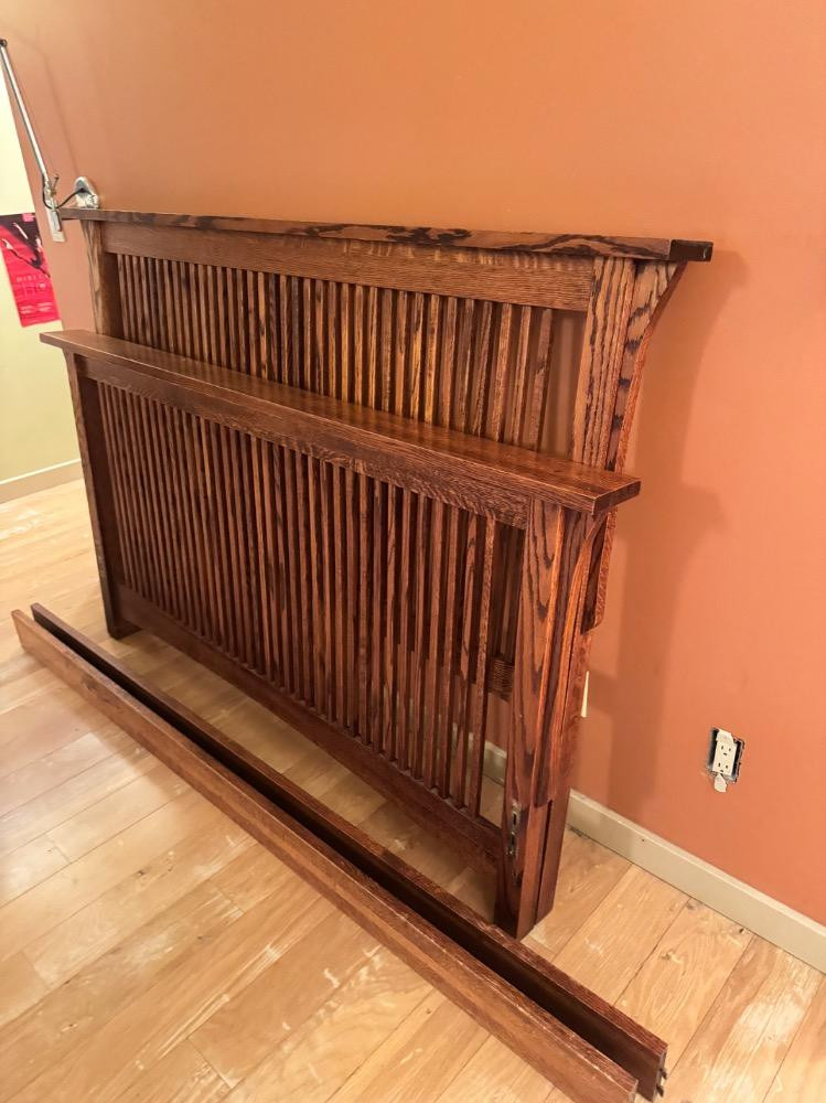 Mission-Style Queen Bed Frame – 69” Wide, Headboard (48”) & Footboard (36”). Bidding on this lot is an agreement that: (1.) You will have 2 capable, able bodied persons to lift and load at a minimum. (2.) You will bring a hand truck and/or any other tools needed to remove this item. If these steps are not followed your item will be forfeit and no refund given.