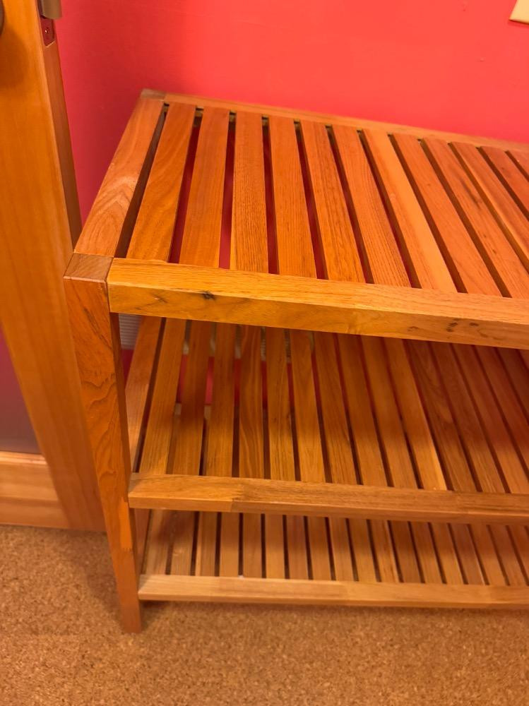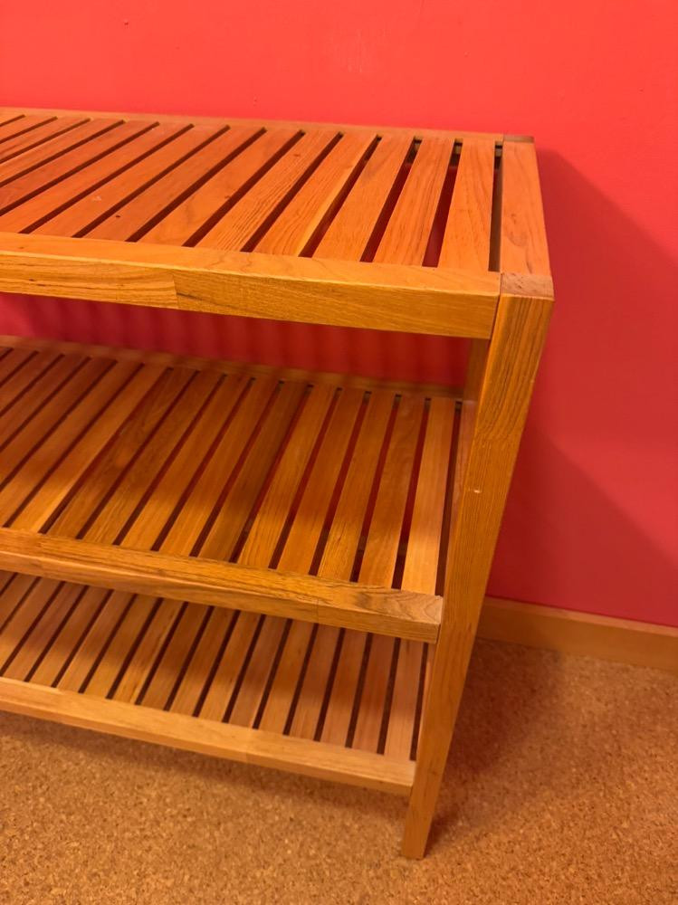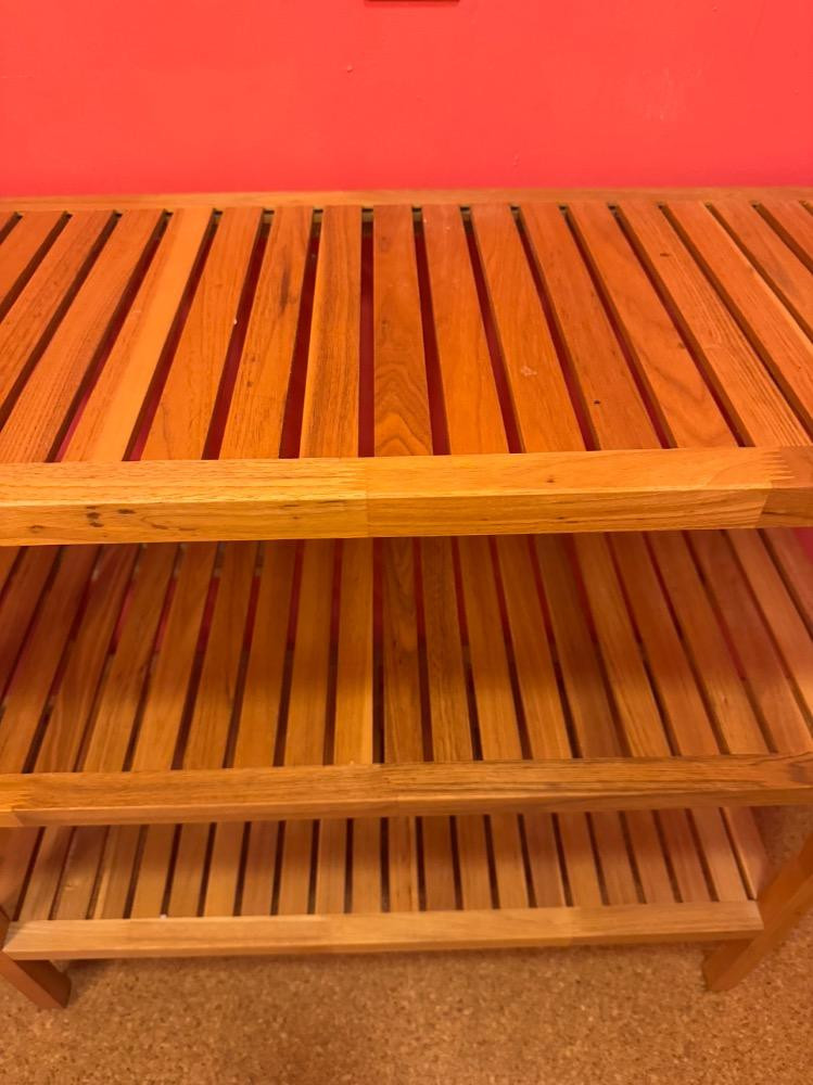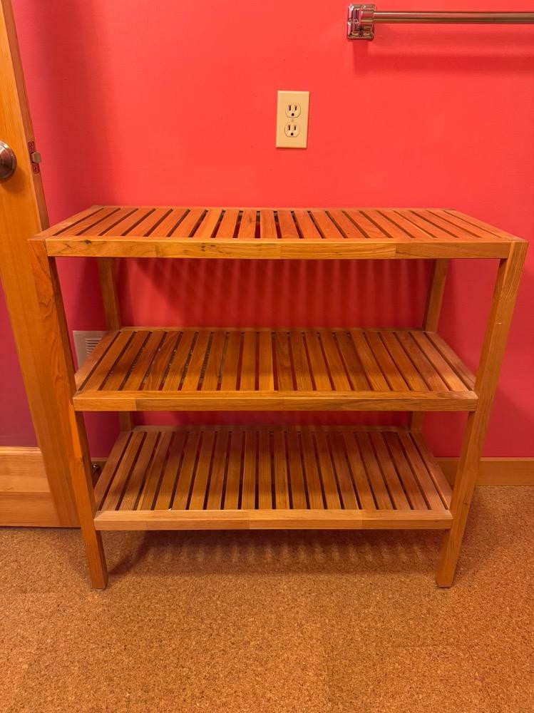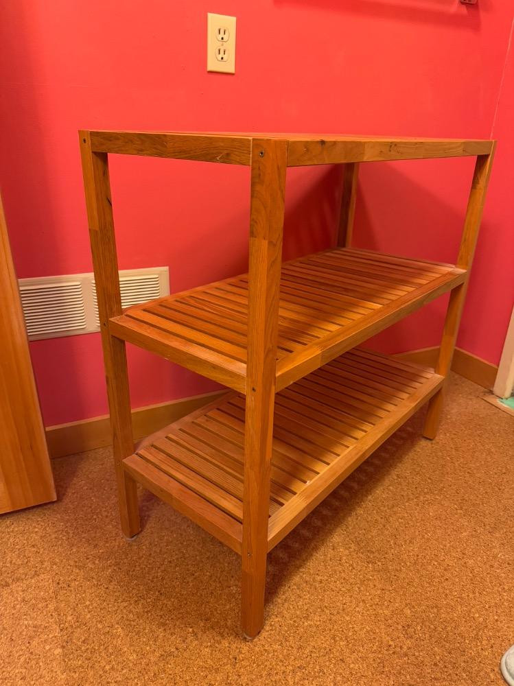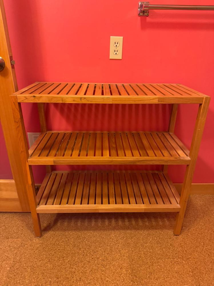 Bamboo 3-Tier Shelf – Slatted Design, Lightweight & Sturdy. 32.5” Wide 14.5” Deep 31.5” Tall Larger than it appears. Bidding on this lot is an agreement that: (1.) You will have 2 capable, able bodied persons to lift and load at a minimum. (2.) You will bring a hand truck and/or any other tools needed to remove this item. If these steps are not followed your item will be forfeit and no refund given.