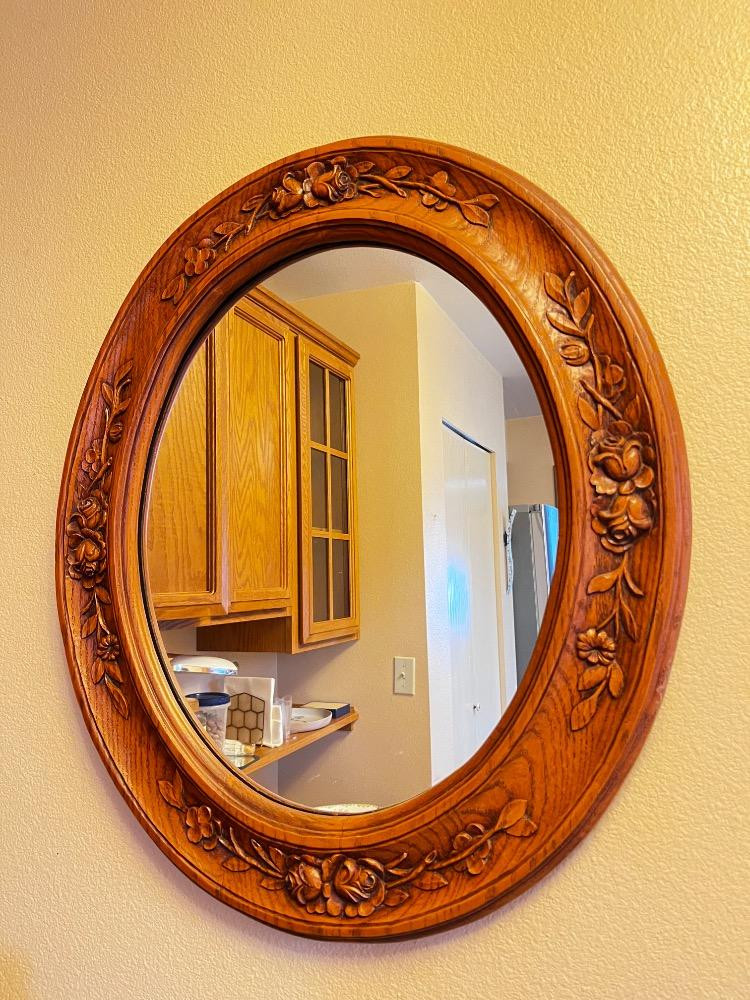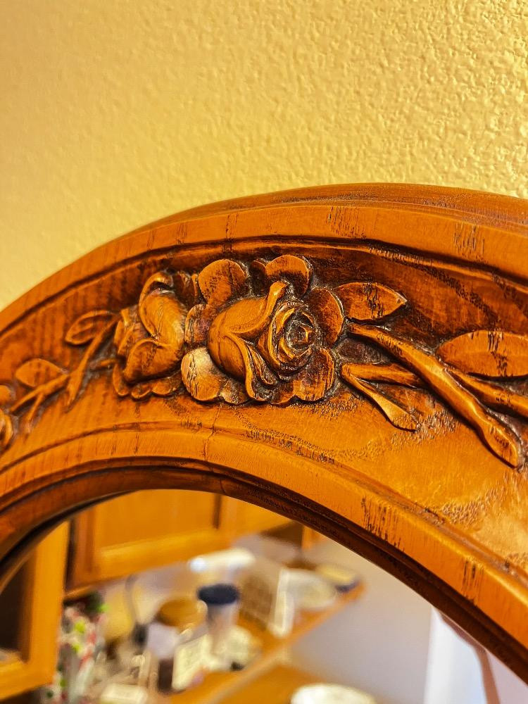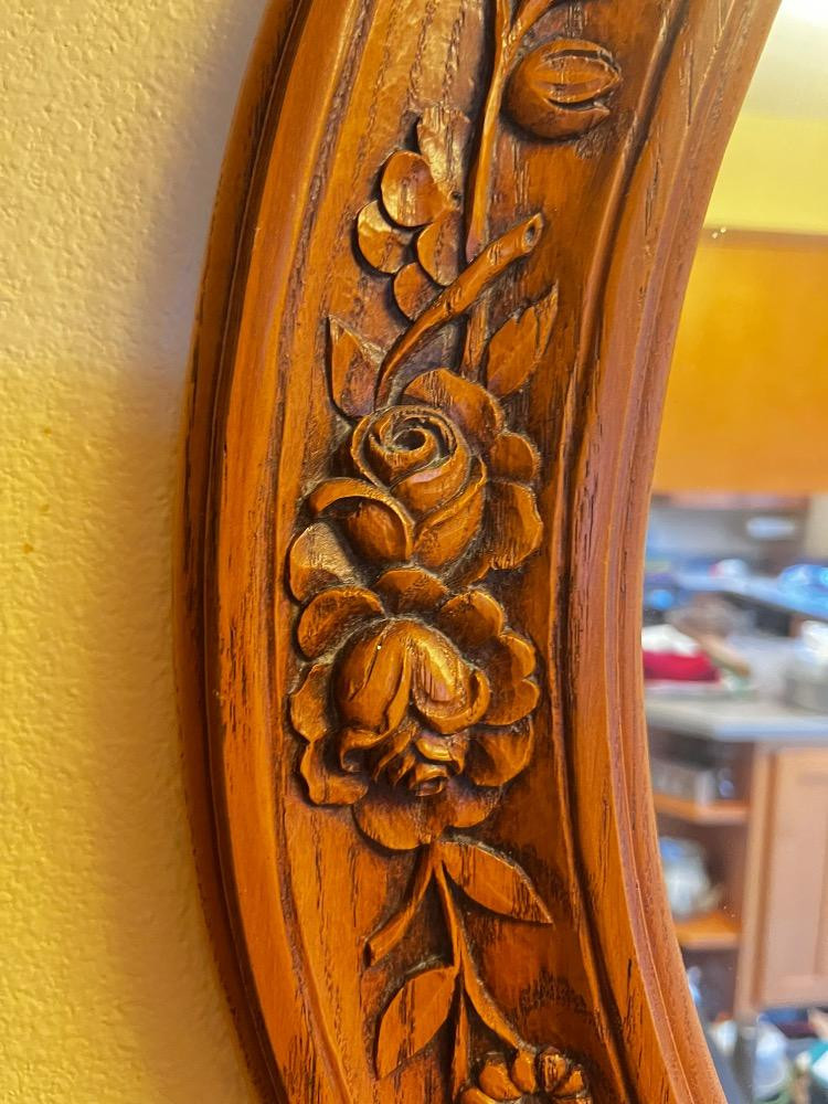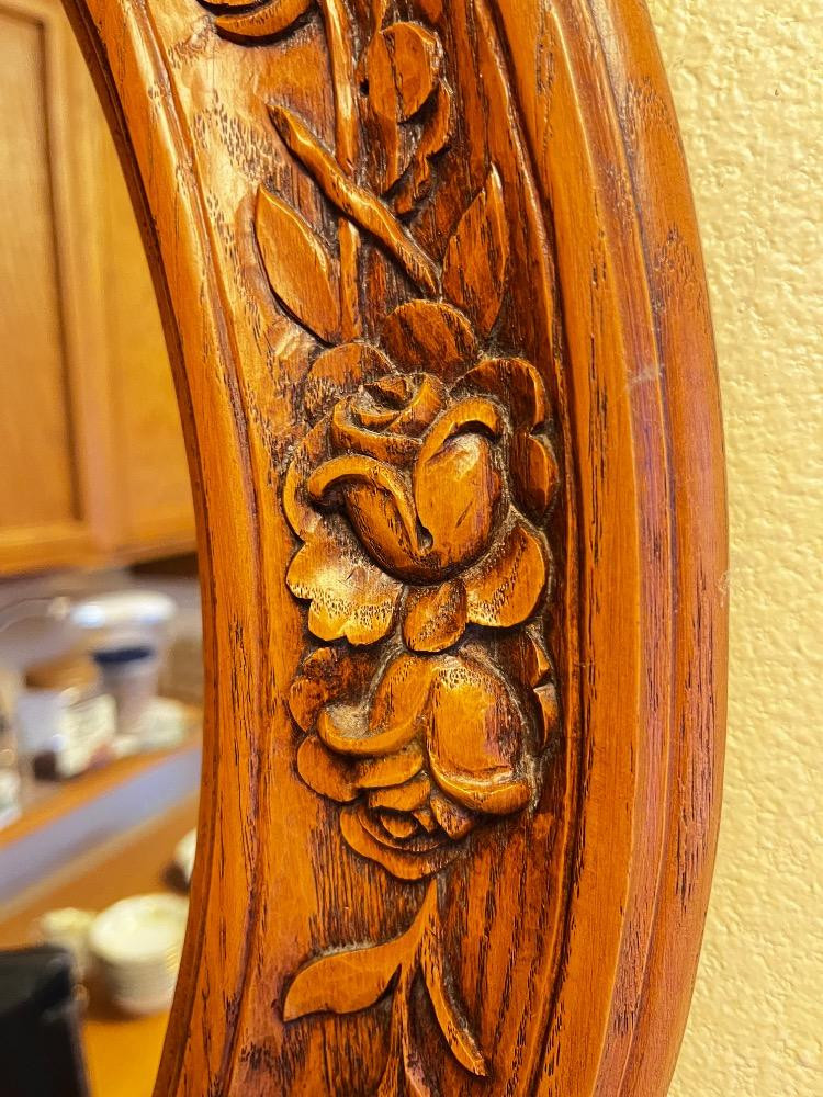 Hand-Carved Oval Mirror – Cabbage Rose Wood Design. 21 1/2" W x 25 1/2" H