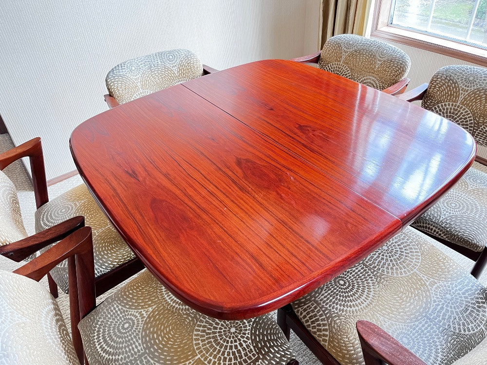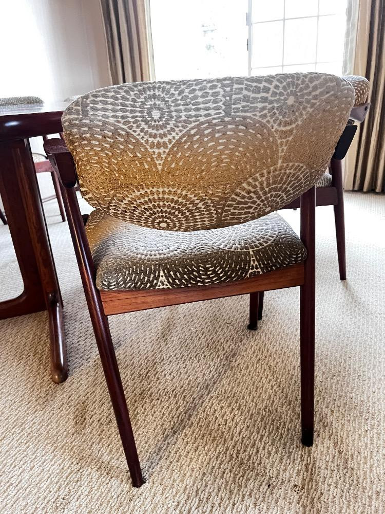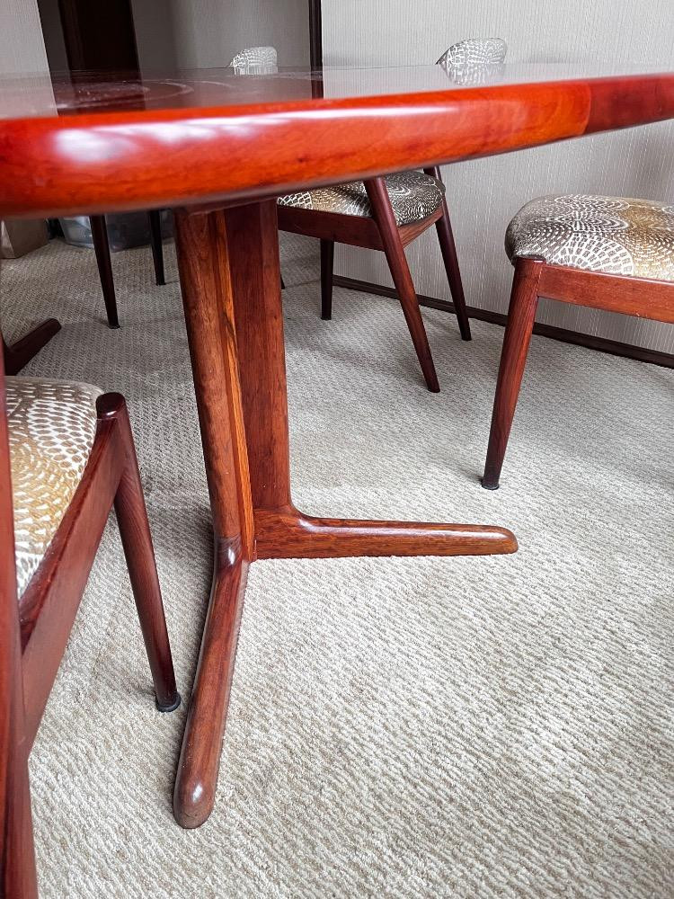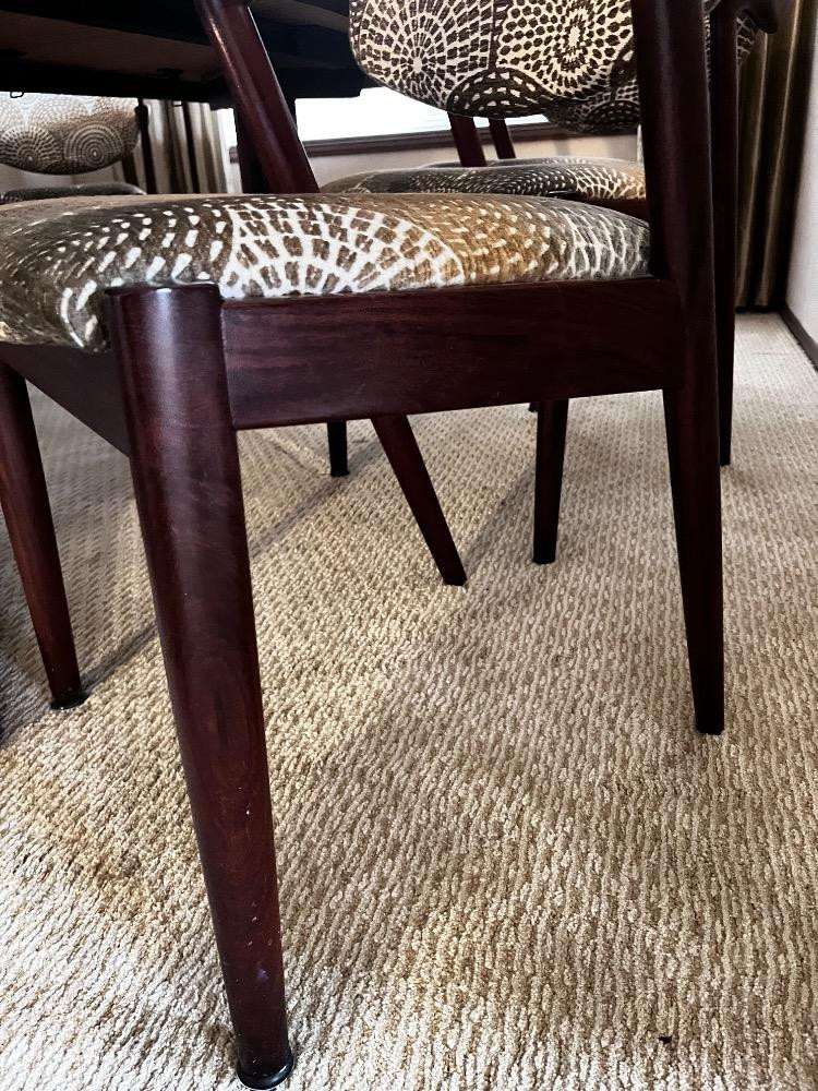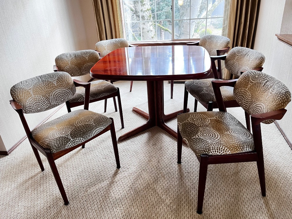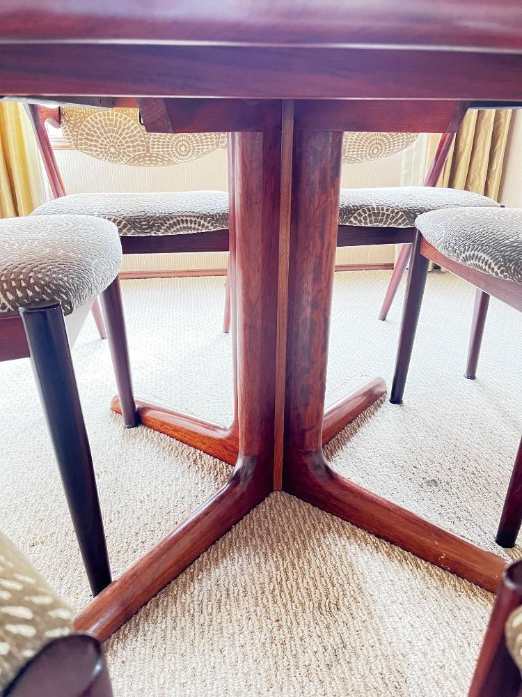 Vintage MCM Split Pedestal Extendable Table + 6 Upholstered Z-Chairs. ***Possibly Kai Kristianson*** Leaves x 2 - 20" Each Table: