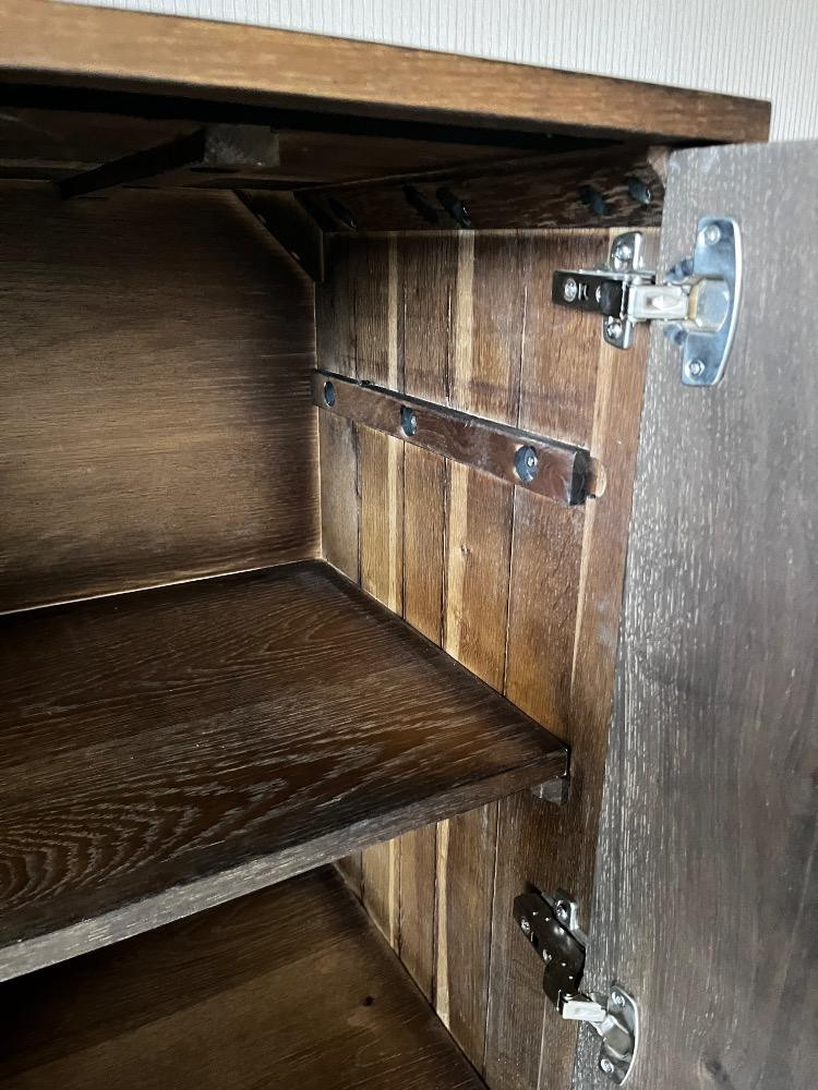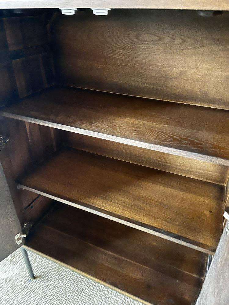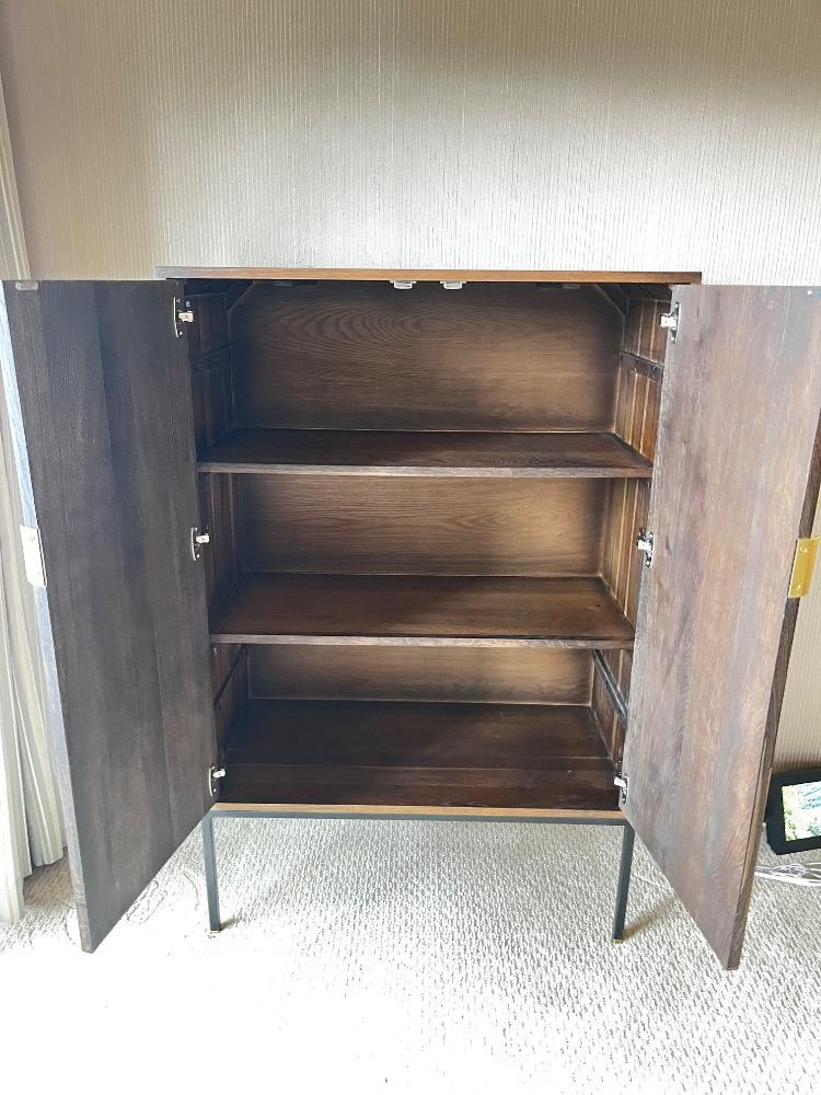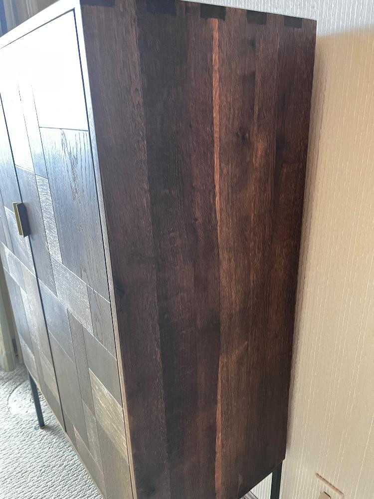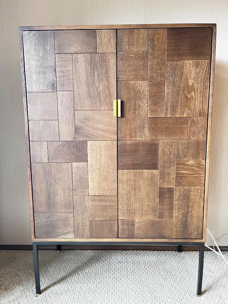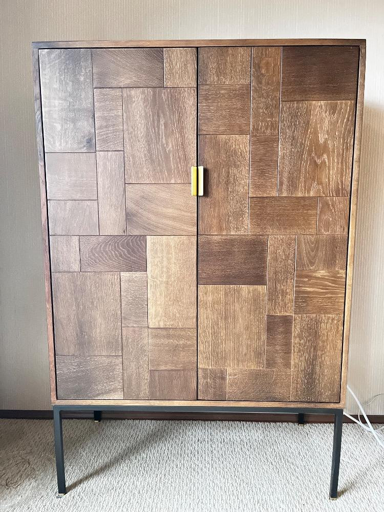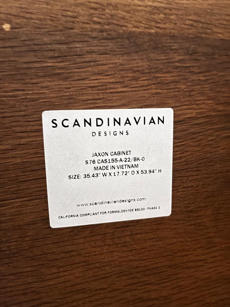 Scandinavian Designs "Jaxon" Cabinet - Modern Patchwork Wood Design. Bidding on this lot is an agreement that: (1.) You will have at least 2 capable, able bodied persons to lift and load at a minimum. (2.) You will bring a hand truck and/or any other tools needed to remove this item. If these steps are not followed your item will be forfeit and no refund given.
