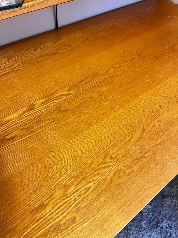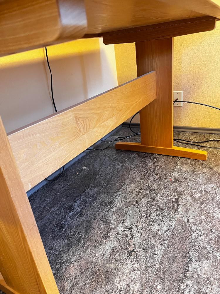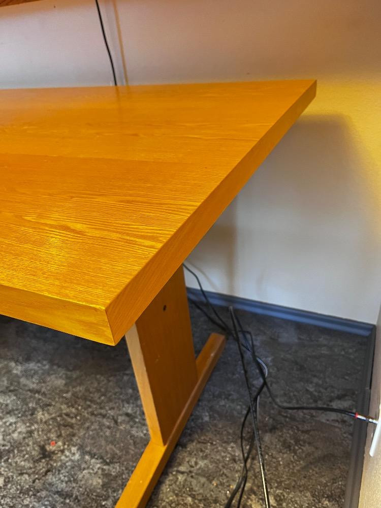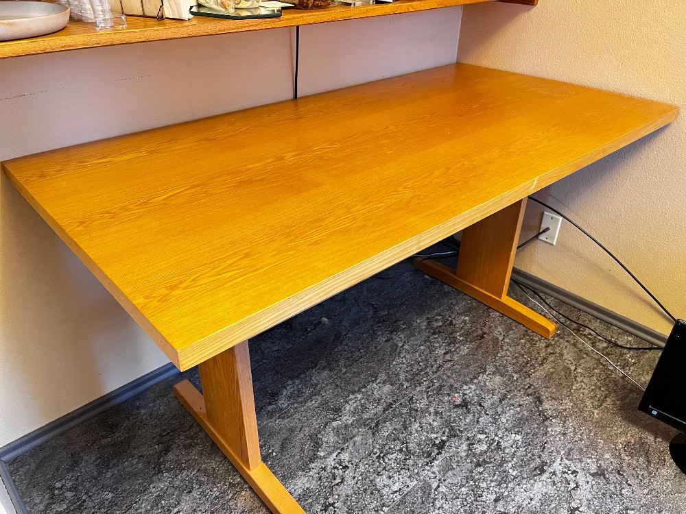 Small Light Wood Dining/Work Table - Trestle Base & Sleek Finish. 60" L x 30" W x 29 1/2" H Bidding on this lot is an agreement that: (1.) You will have at least 2 capable, able bodied persons to lift and load at a minimum. (2.) You will bring a hand truck and/or any other tools needed to remove this item. If these steps are not followed your item will be forfeit and no refund given.