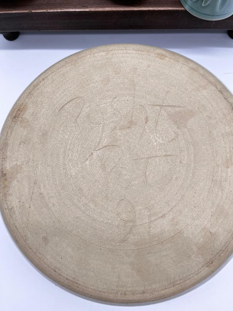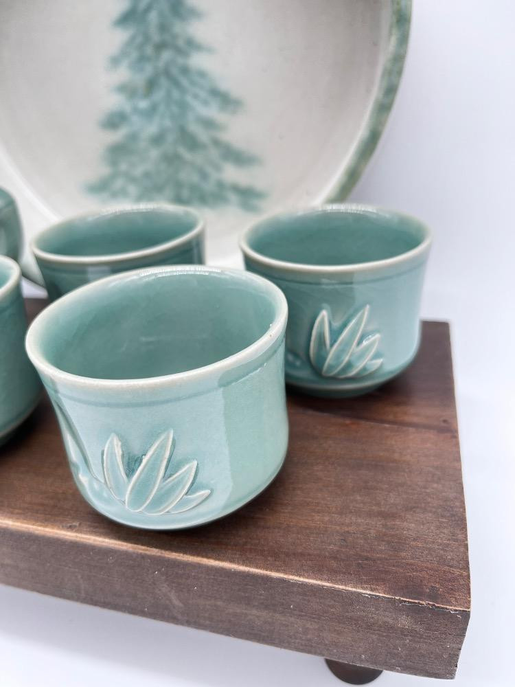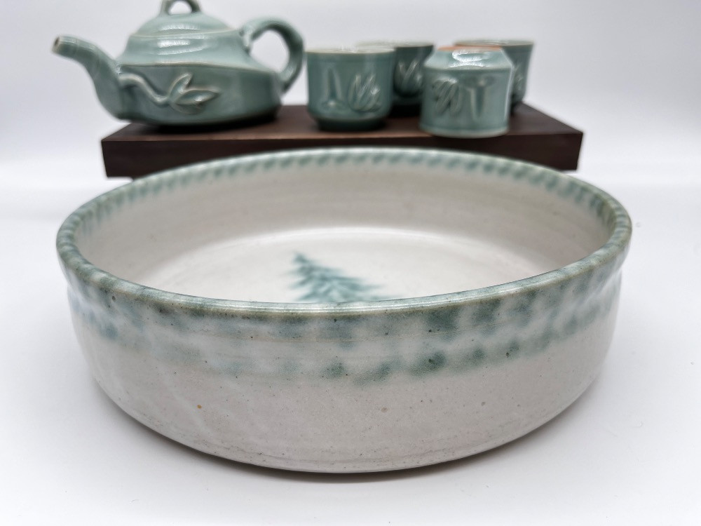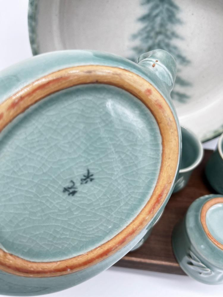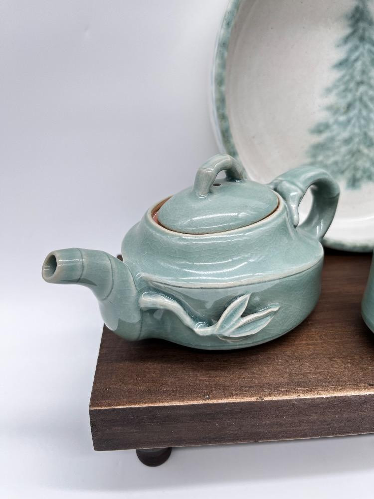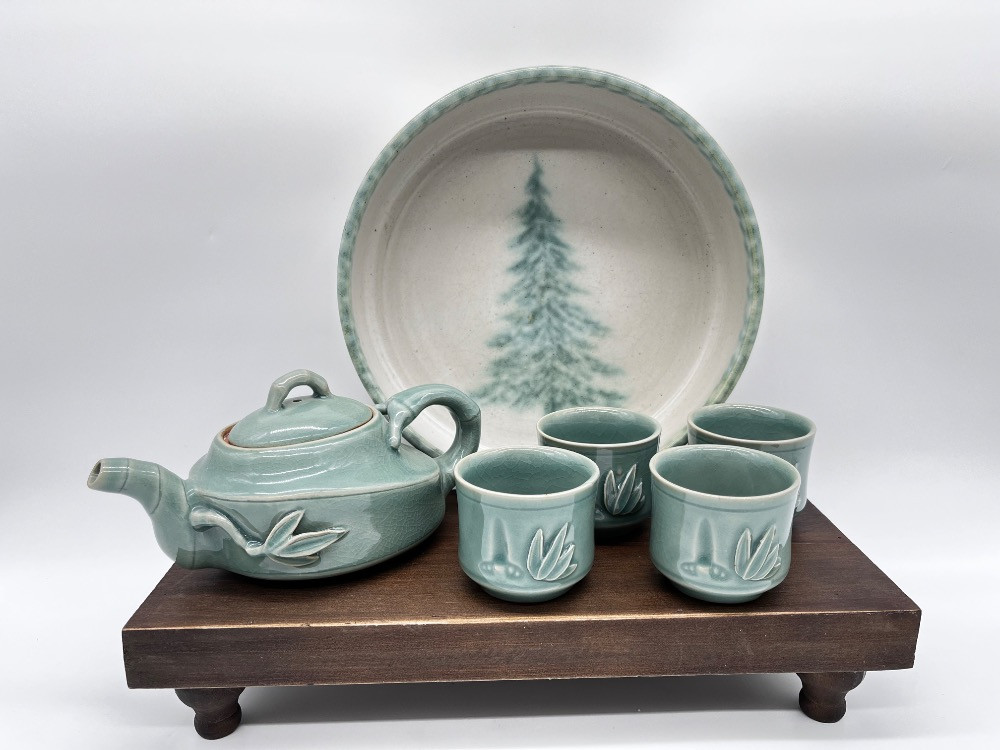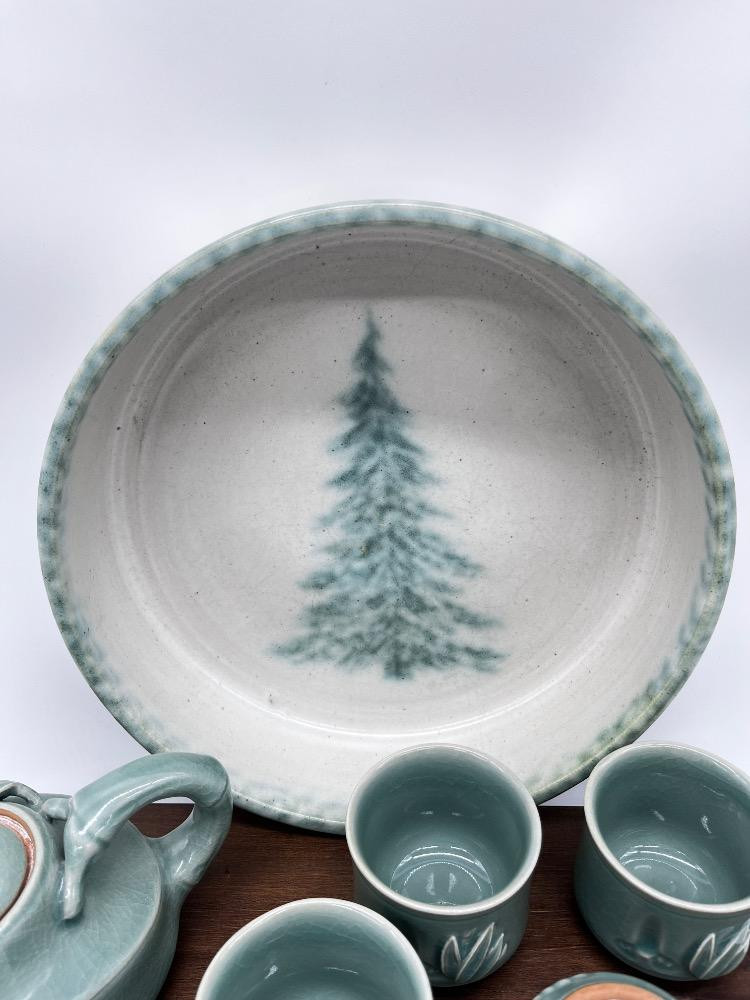 Antique Korean Celadon Teapot Set + Signed Pysht Pottery ’91. Signed Pysht Pottery ’91 – Evergreen Christmas Tree Design - 10" Round