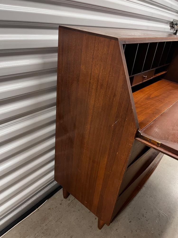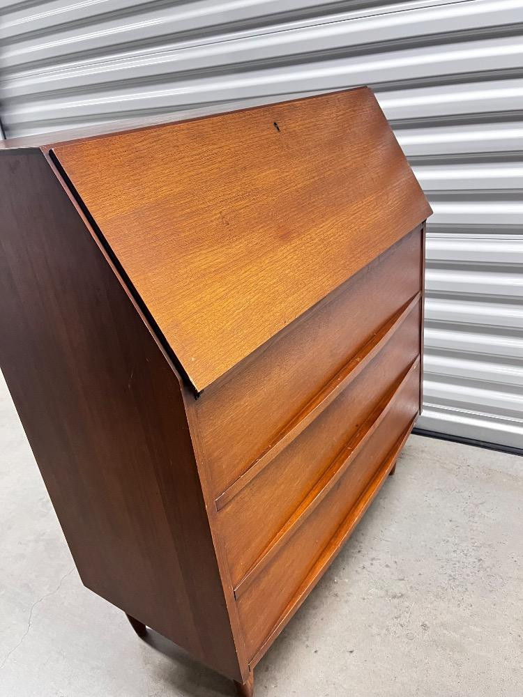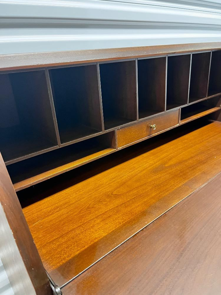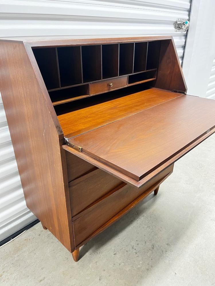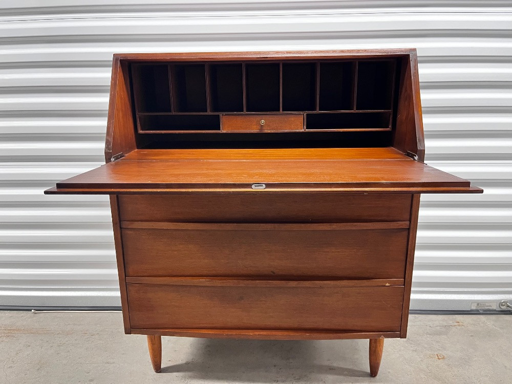 Vintage MCM Secretary Desk – Tapered Legs, Drop-Front, & Drawers. 32 L x 16 W x 38 1/2 H Bidding on this lot is an agreement that: (1.) You will have at least 2 capable, able bodied persons to lift and load at a minimum. (2.) You will bring a hand truck and/or any other tools needed to remove this item. If these steps are not followed your item will be forfeit and no refund given.