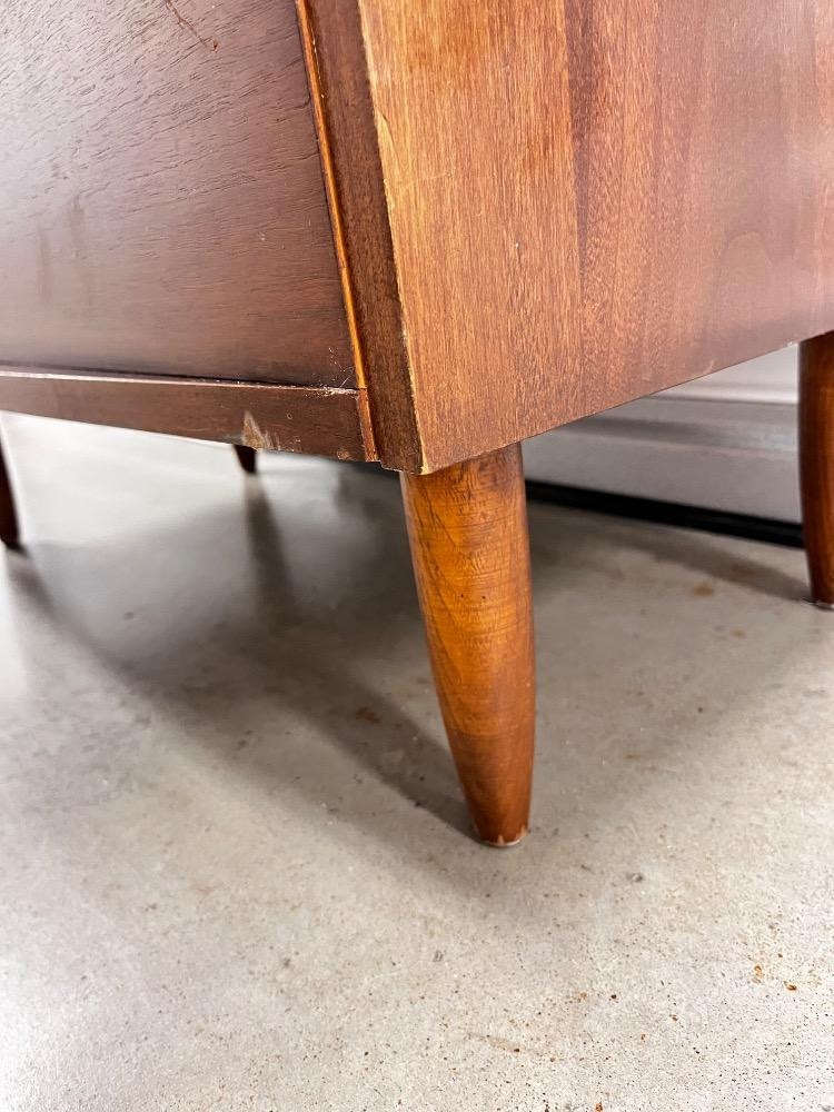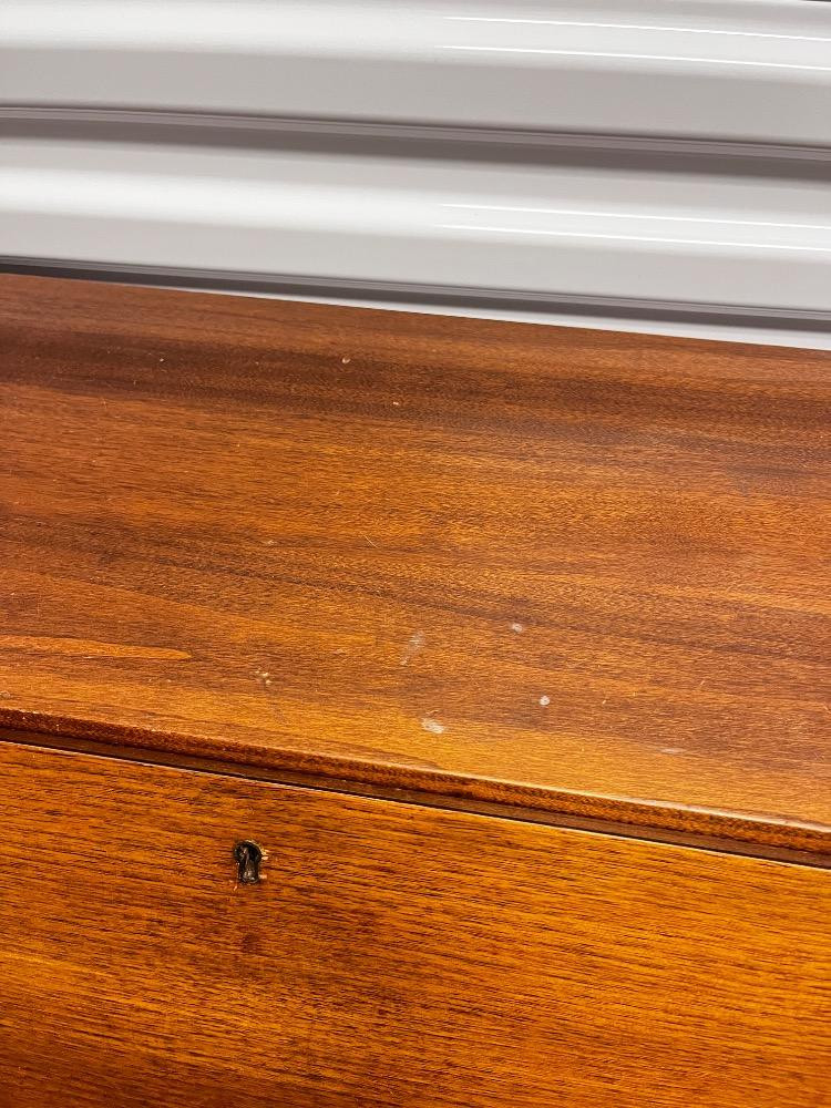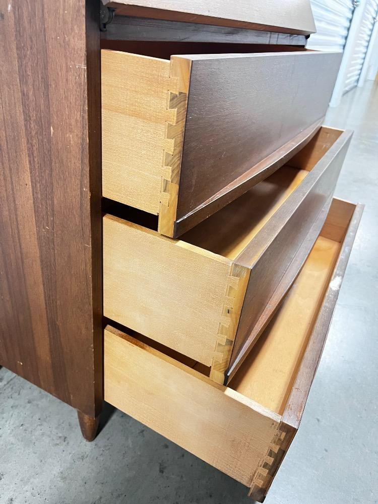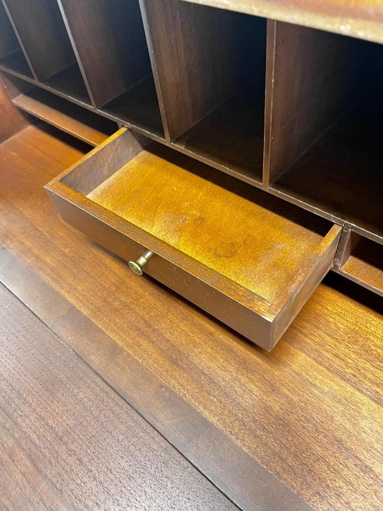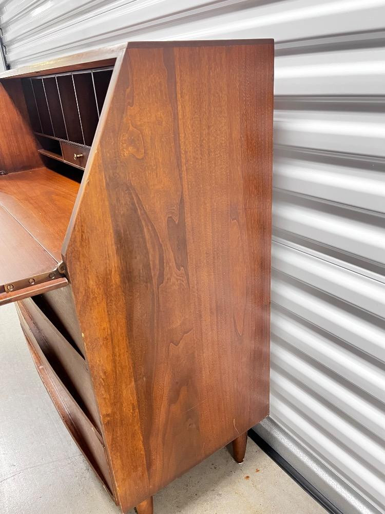 Vintage MCM Secretary Desk – Tapered Legs, Drop-Front, & Drawers. 32 L x 16 W x 38 1/2 H Bidding on this lot is an agreement that: (1.) You will have at least 2 capable, able bodied persons to lift and load at a minimum. (2.) You will bring a hand truck and/or any other tools needed to remove this item. If these steps are not followed your item will be forfeit and no refund given.