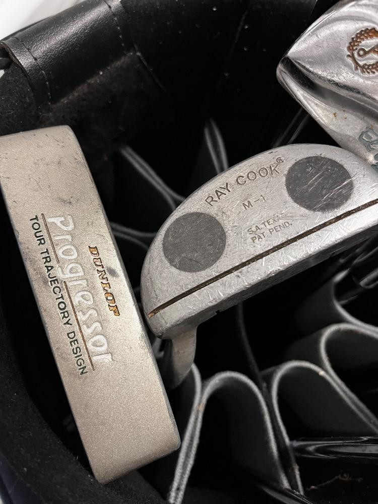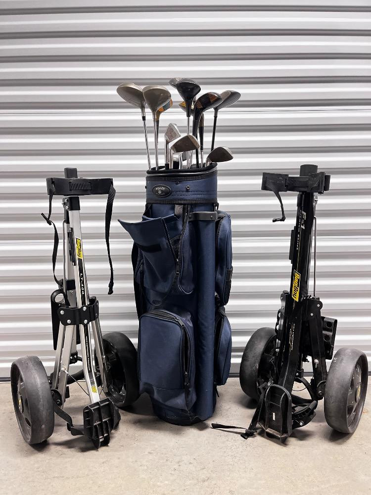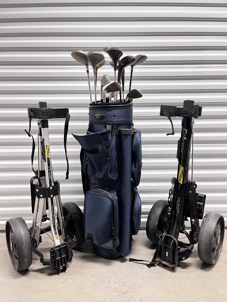 Lot # 72 - Vintage Golf Set – Miller Bag, Bag Boy Carts & Assorted Branded Clubs