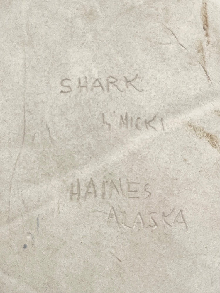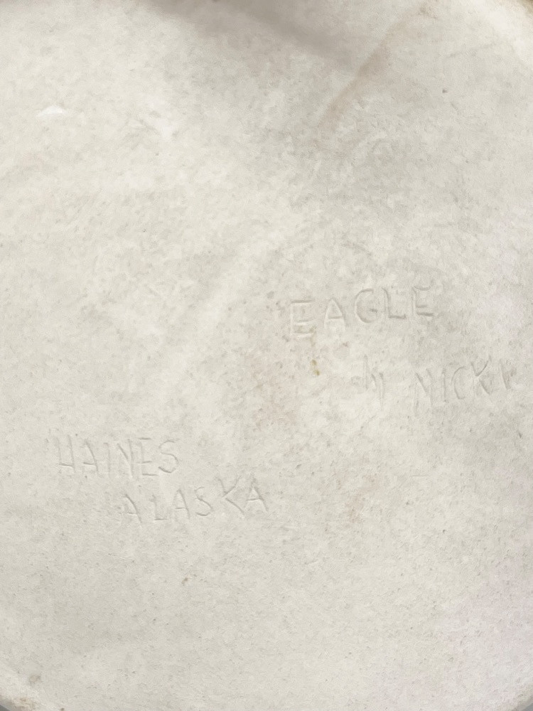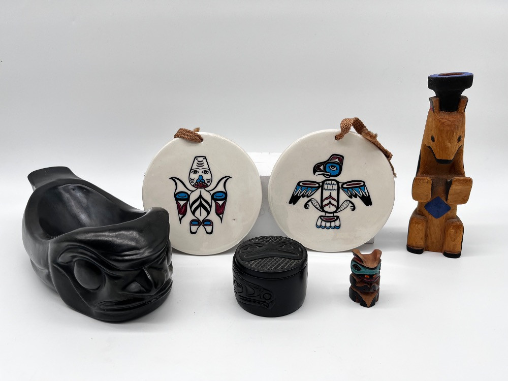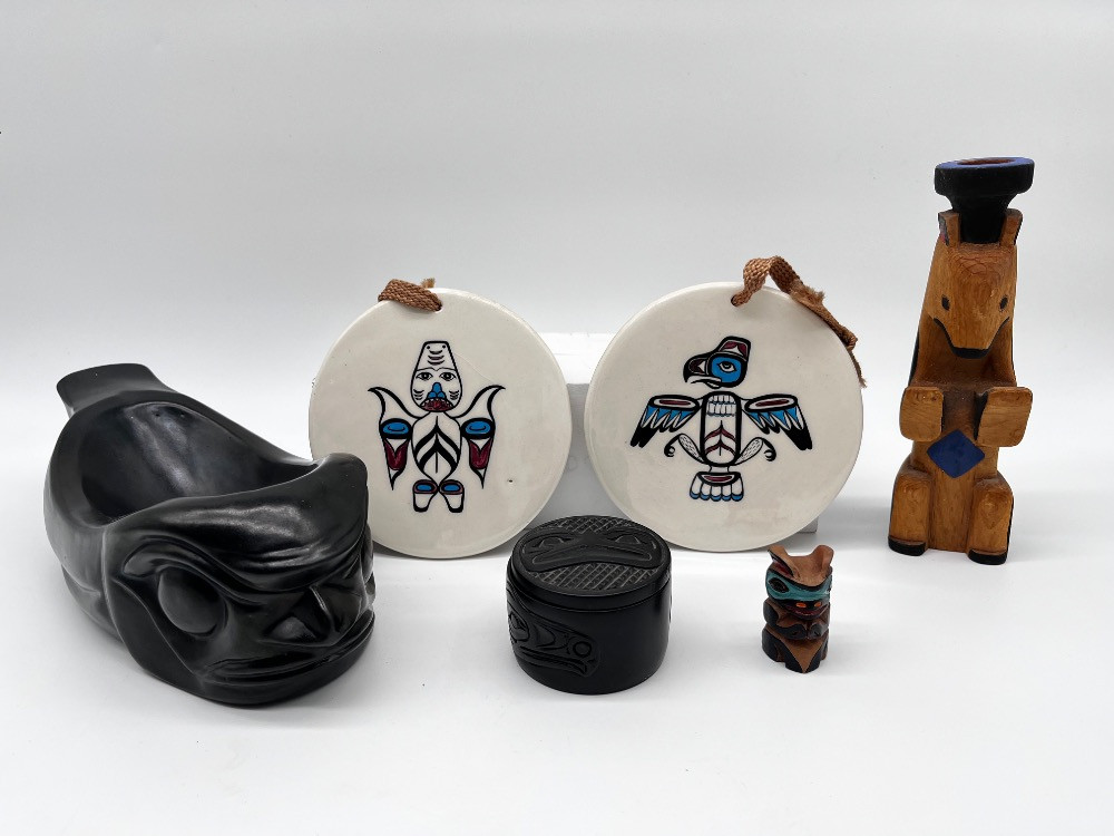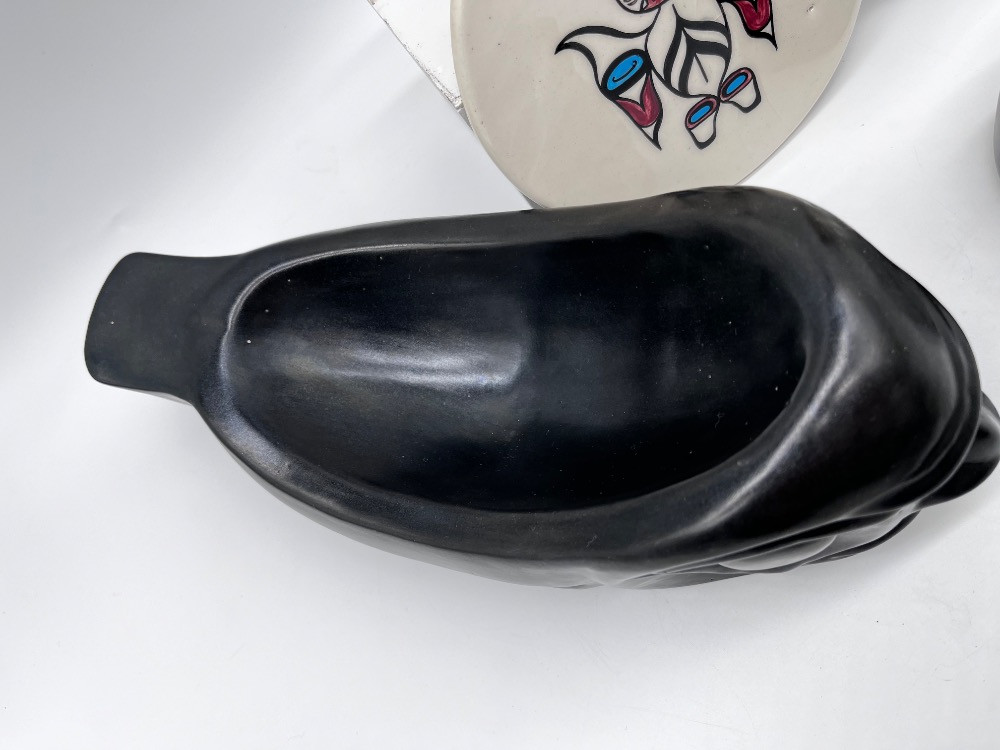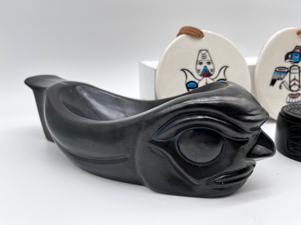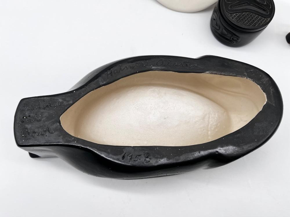 Alaskan Native Art Lot: Oil Bowl, Totem Carvings, Hand-Painted Discs + Black Carved Indian Oil Bowl - 1958 - 10" W