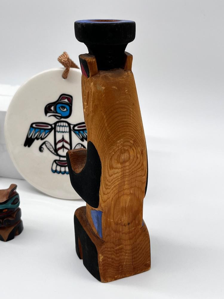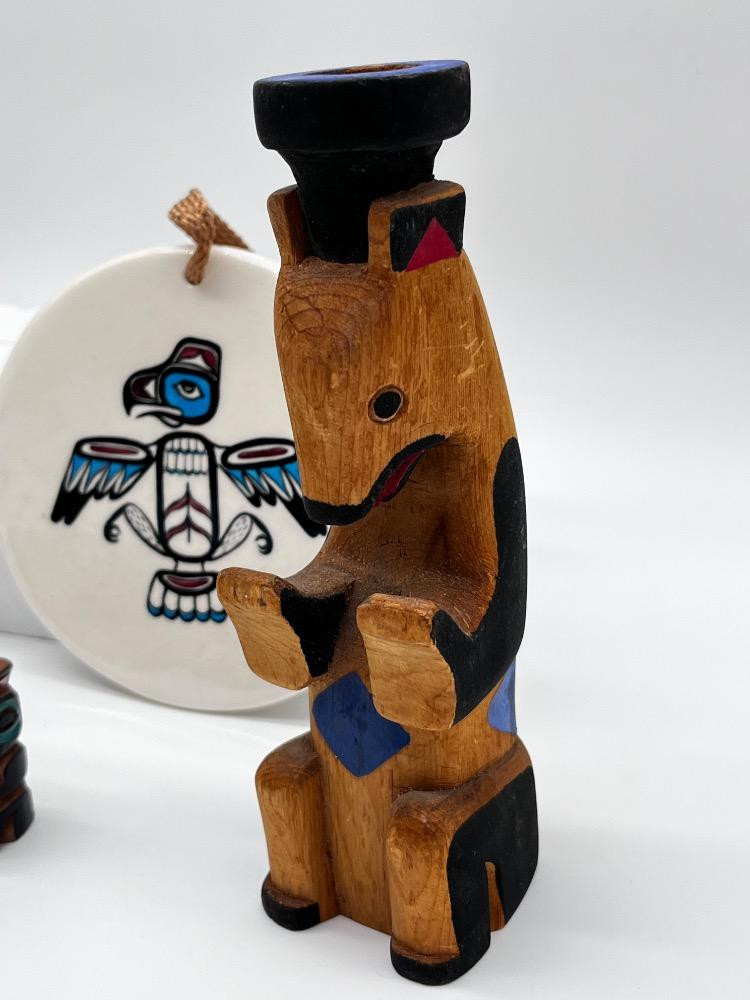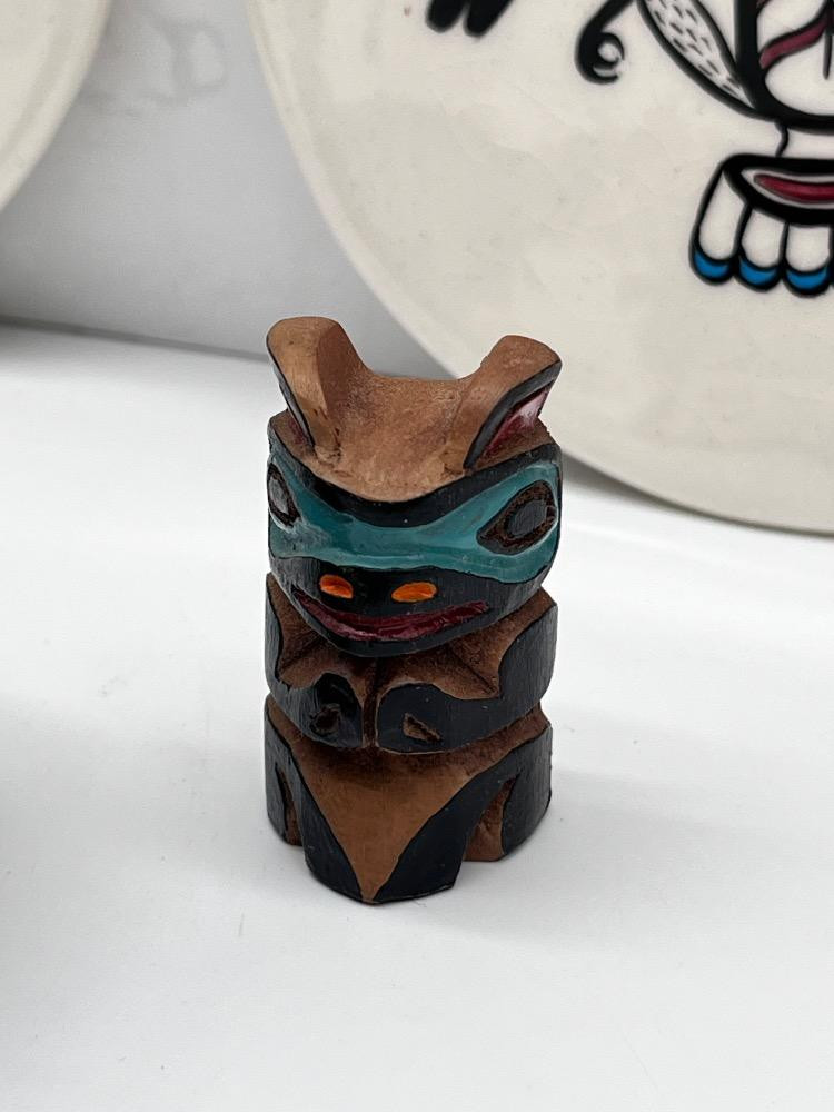 Lot # 78 - Alaskan Native Art Lot: Oil Bowl, Totem Carvings, Hand-Painted Discs +