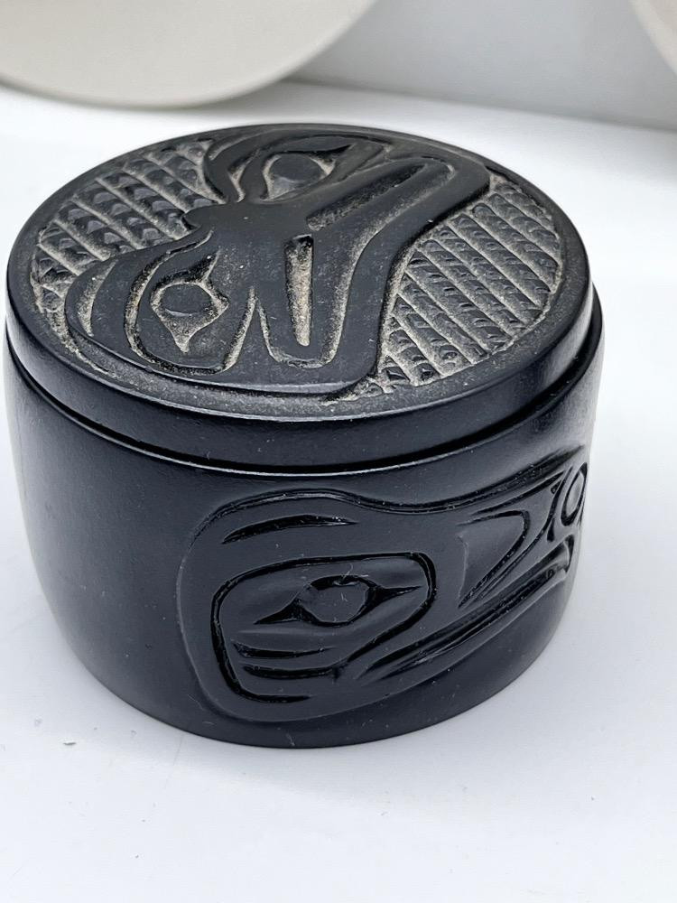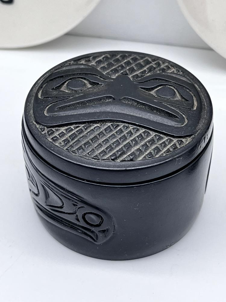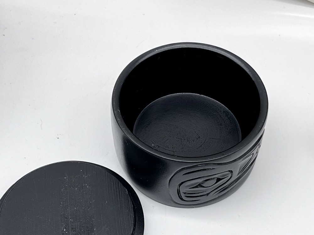 Small Black Carved Round Box (Helen’s Shop, Jewelry & Gifts, Haines, Alaska) - 2" Tall