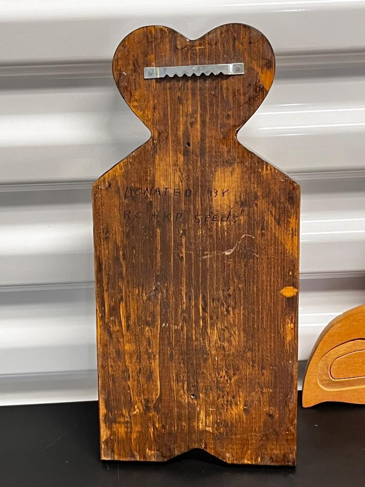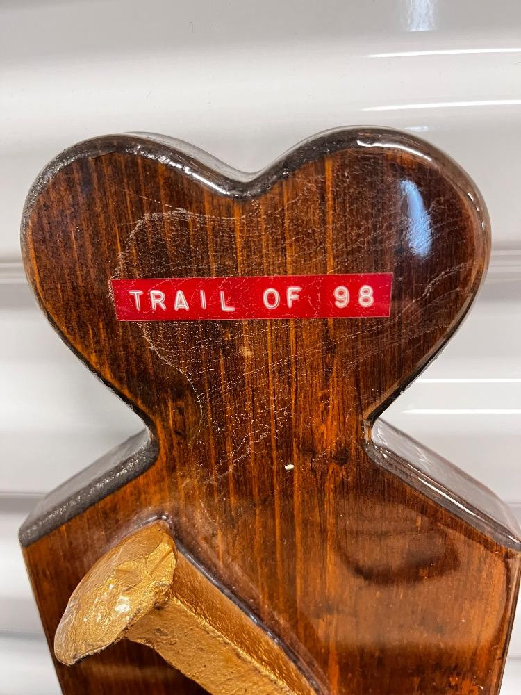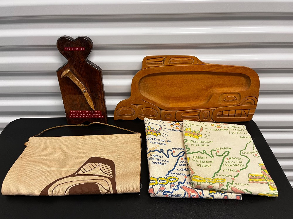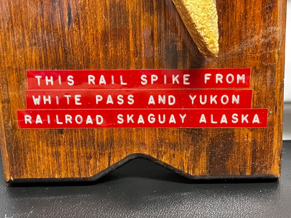 Alaska & Northwest Coast Indigenous Collectibles – Railroad Spike, Carved Tray, Fabric Prints & Wall Hanging. Trail of '98 White Pass & Yukon Railroad Spike Souvenir - 11 1/2" H x 5 1/2" W
