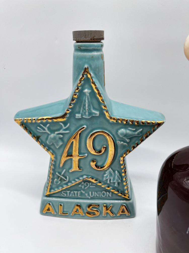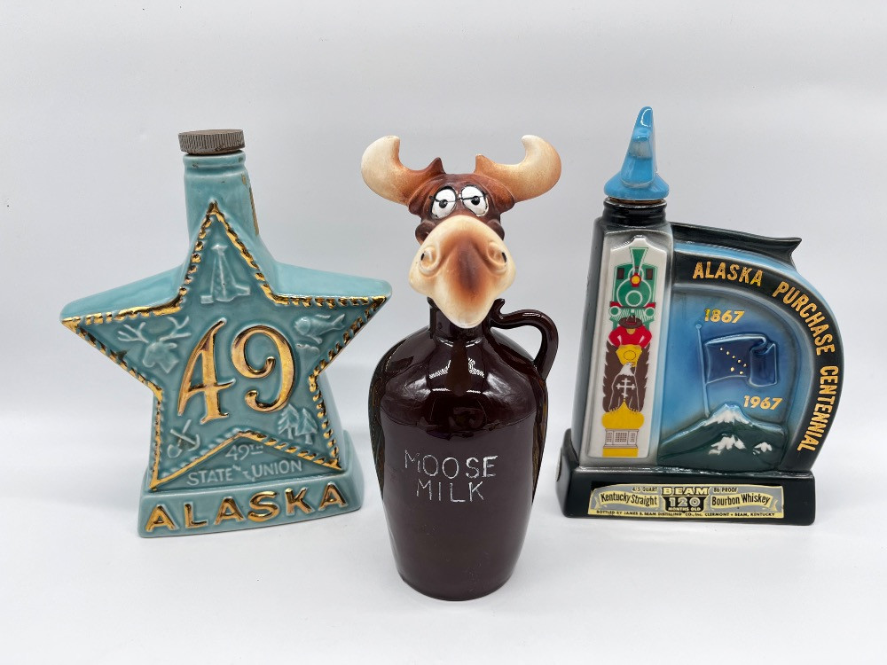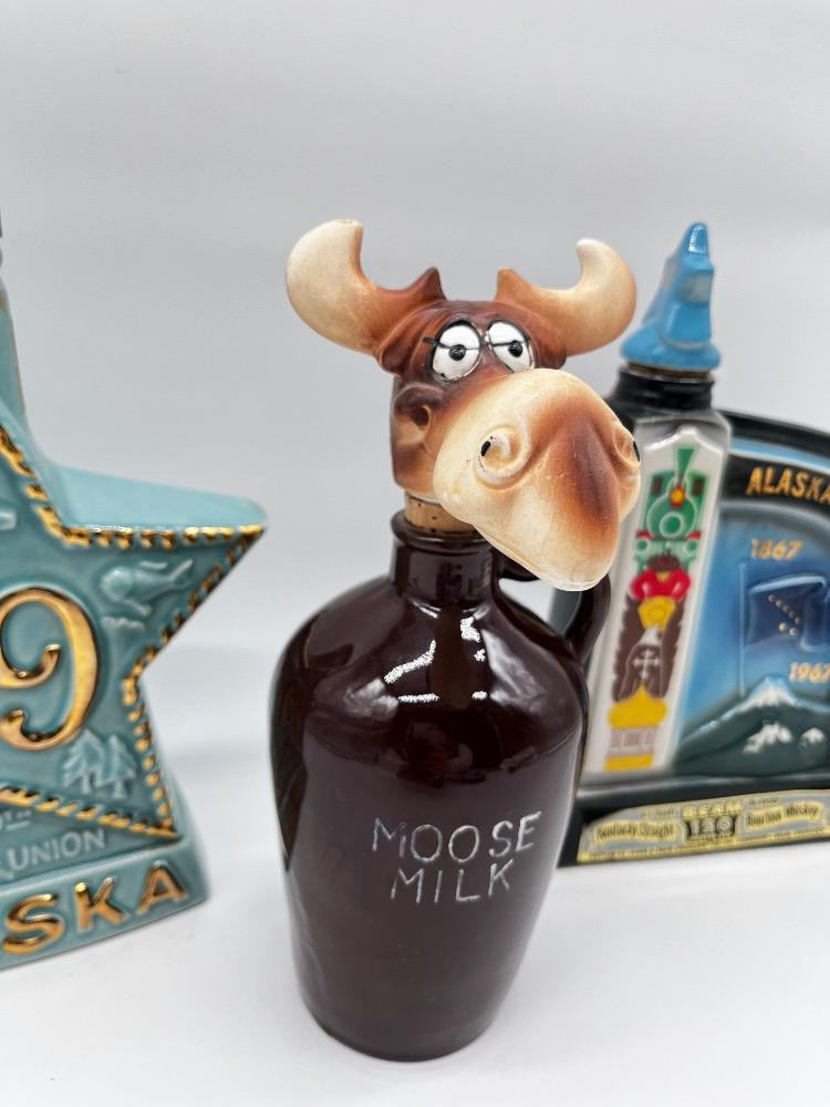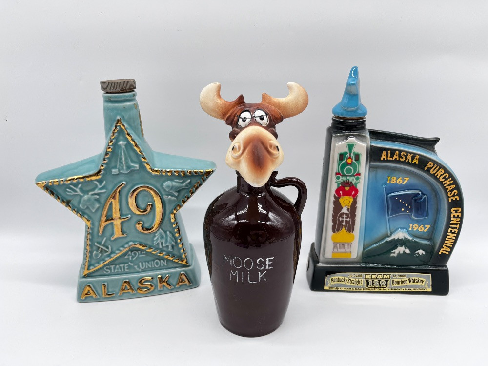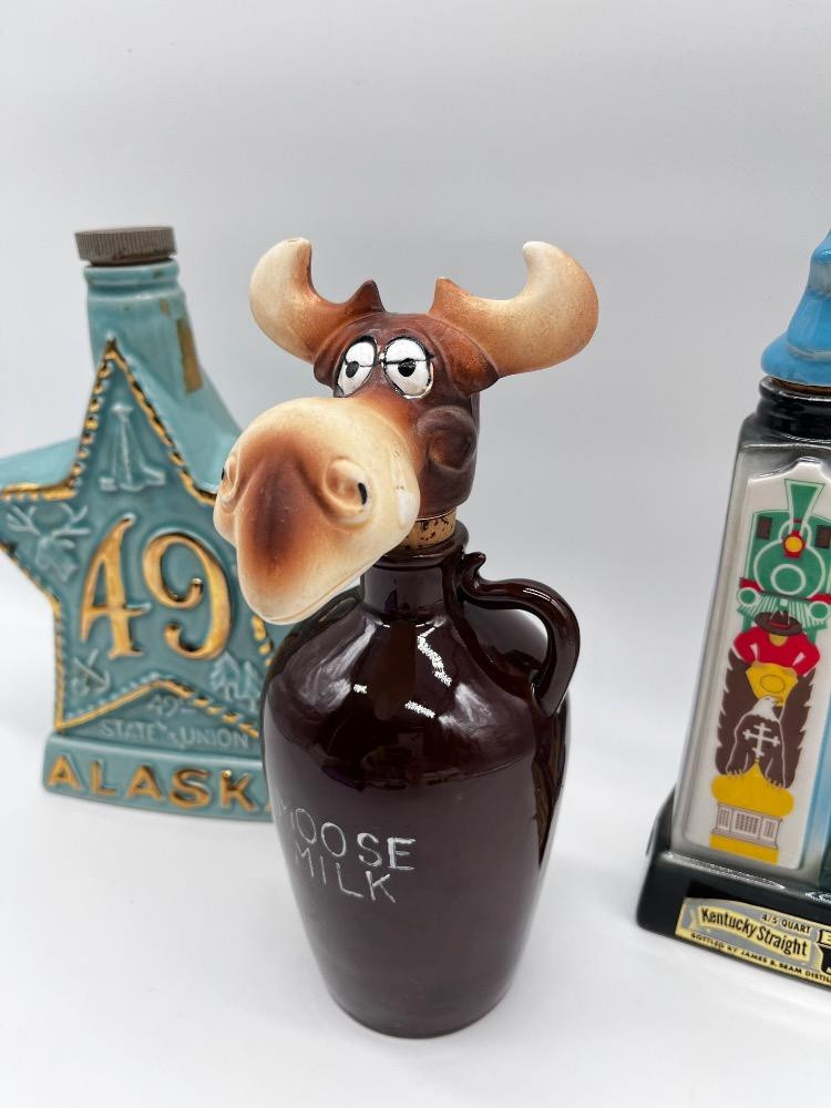 3 Alaska Whiskey Decanters – Moose, Jim Beam 49th State, Centennial. Moose Milk Jug / Decanter With Cork Vintage 1958 Jim Beam Alaska Star Celebrating 49 State Bottle Decanter Alaska Purchase Centennial 1867-1967 49Th State Whiskey Bottle 10" Height
