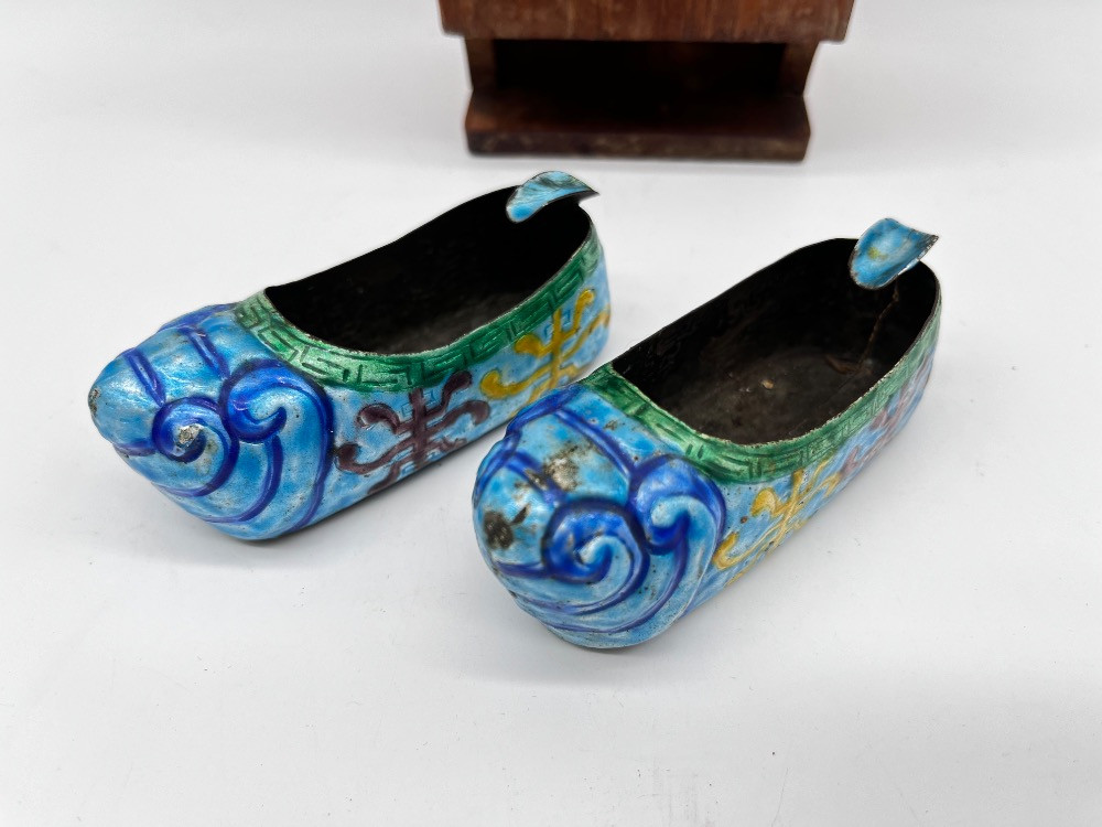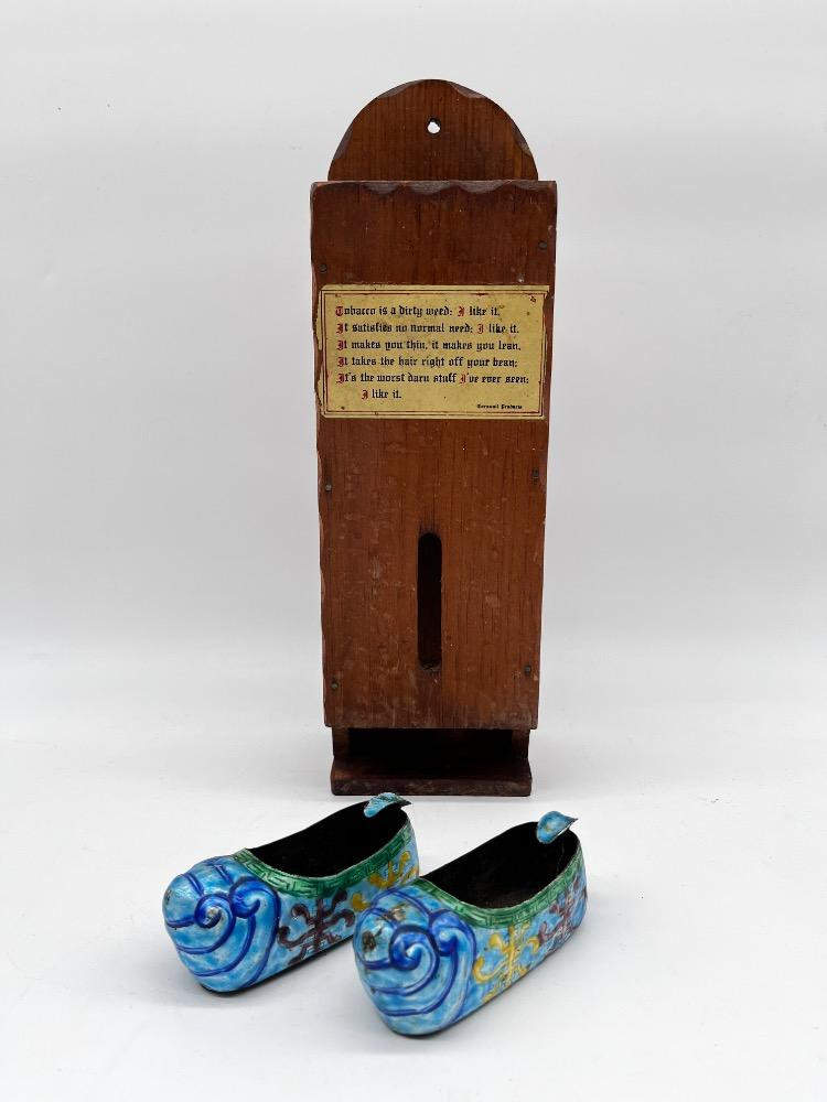 Antique Chinese Enamel Shoe Ashtrays (Blue & Green) + Vintage Wooden Cigarette Box Holder. Antique Chinese Enamel Shoe Ashtray - Blue Green