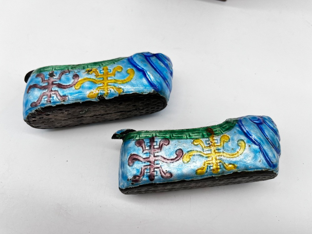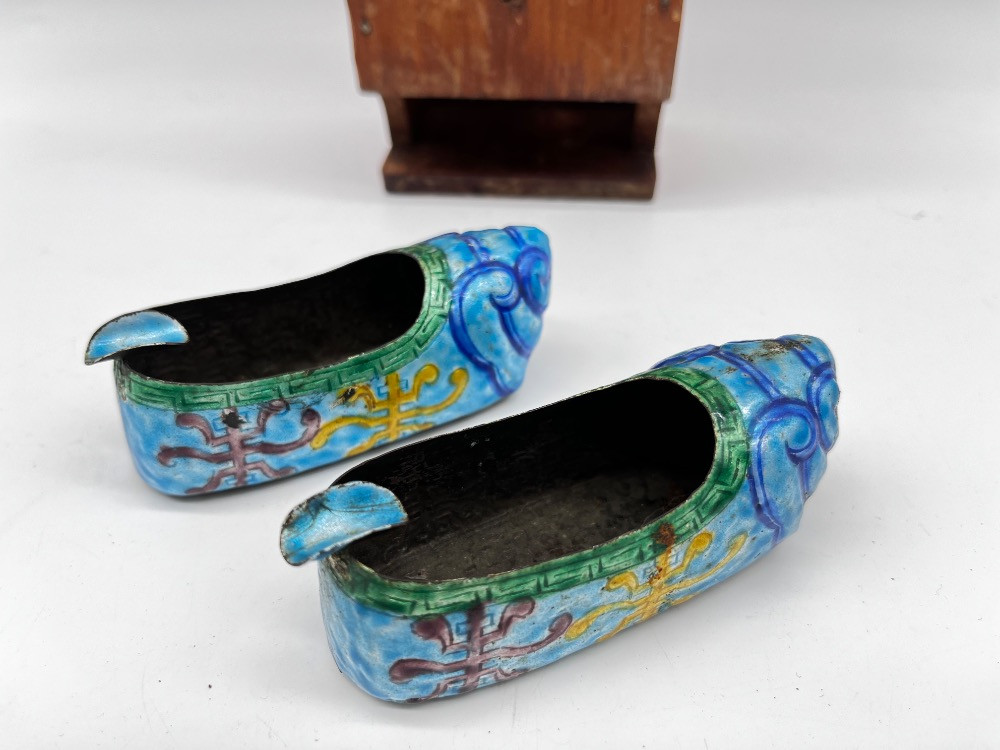 Lot # 100 - Antique Chinese Enamel Shoe Ashtrays + Vintage Cigarette Box Holder