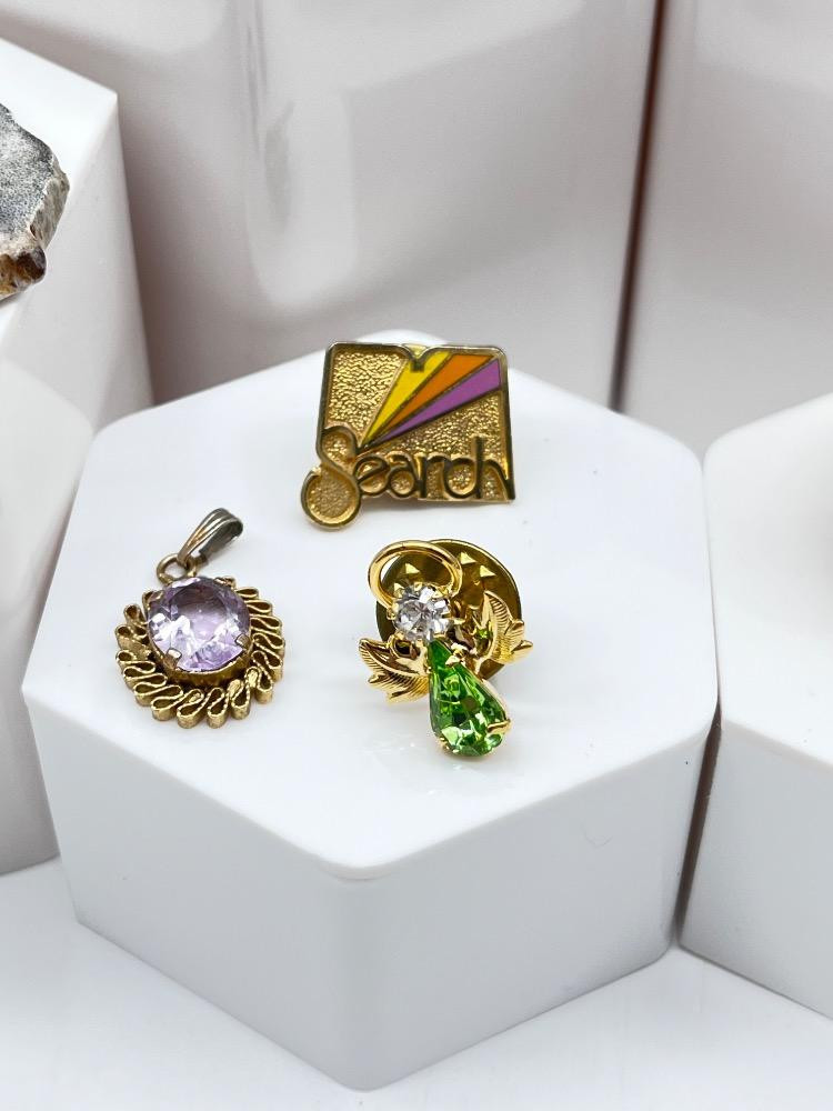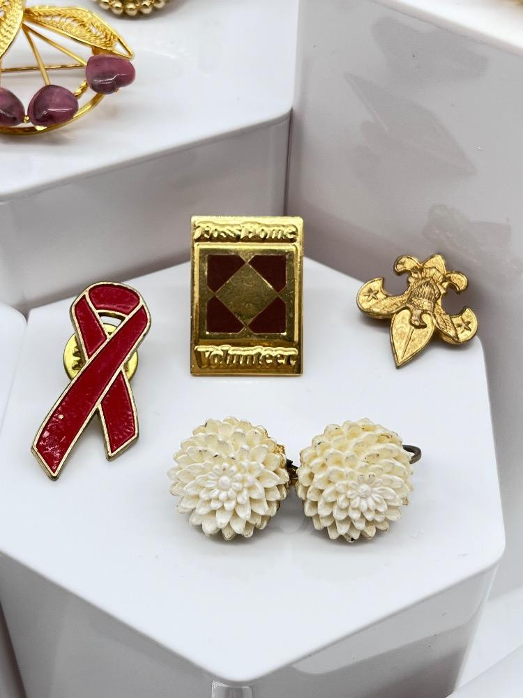 Vintage & Antique Jewelry Lot – Brooches, Pins, Rings & More – Love Knot, Boy Scout, Floral. Victorian Paste Stone Love Knot Pin Pendant Vintage Gold Tone Brooch, Filigree Yellow Gold Abalone Ring Vintage Flower & Leaf Pin Brooch Red Ribbon Awareness Pin Antique 1930’S To 40’S Era Boy Scout Pin Vintage Carved Off White Flower Brooch And More. Disclaimer: We do not test the metals of the items listed for auction. By placing a bid, you acknowledge and agree that you are purchasing the item "as is" and without any guarantee of metal quality. We do not offer refunds based on metal content or purity.