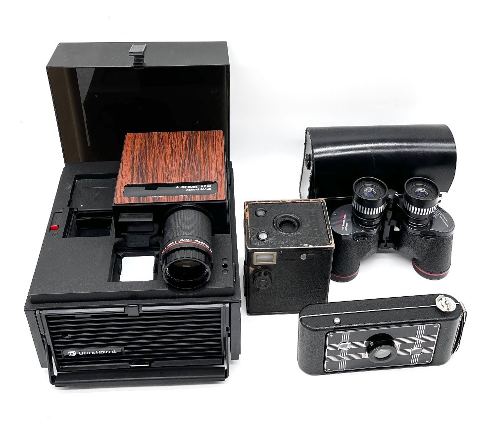 Lot # 122 - Vintage Cameras & Optics Lot – Bell & Howell Slide Cube, Jiffy Kodak +