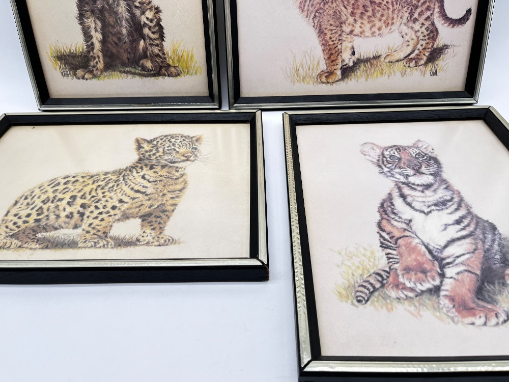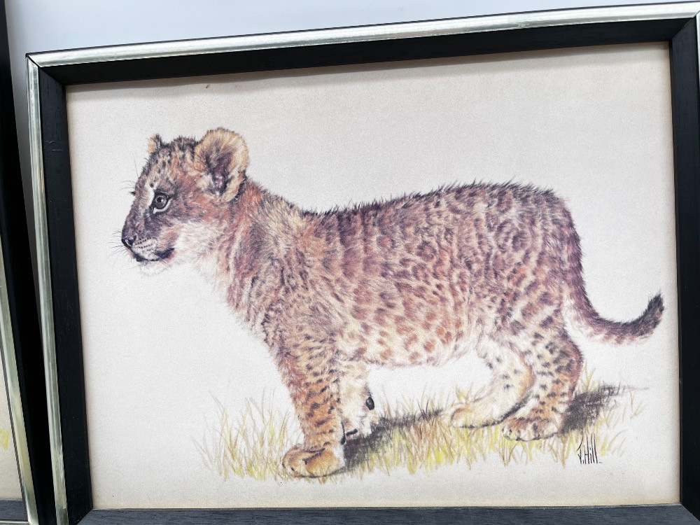 Lion Cub Signed J. Hill Vintage Print + Cheetah, Leopard, Tiger Cubs. 10" H x 13" W