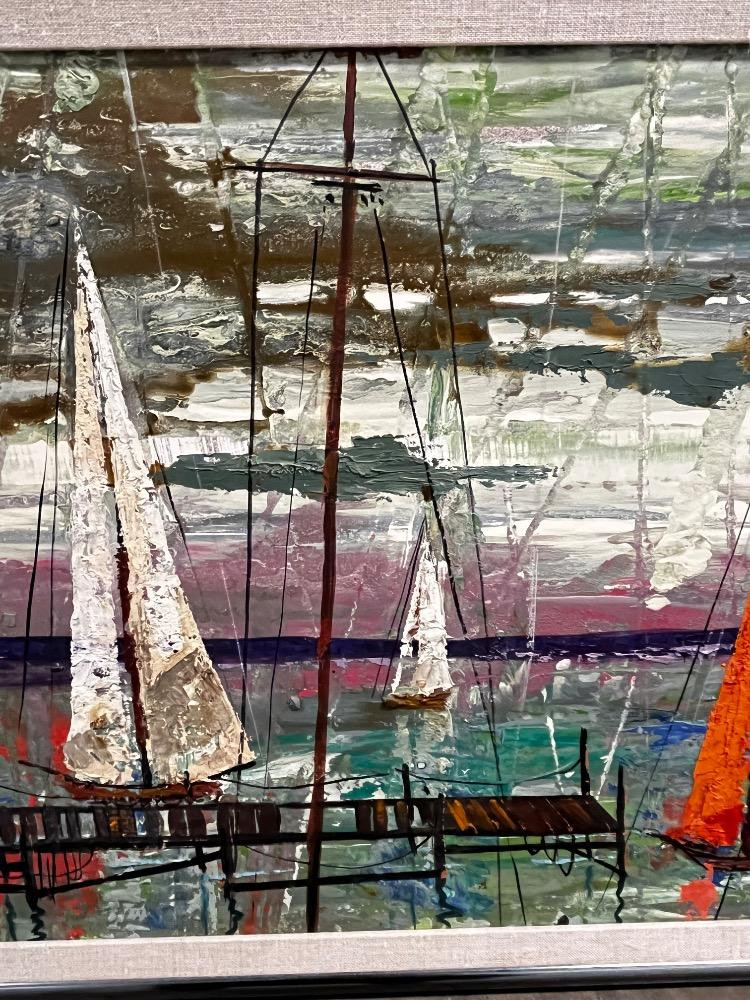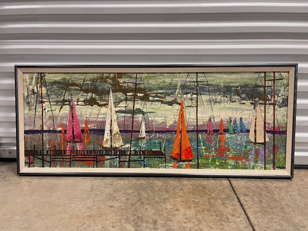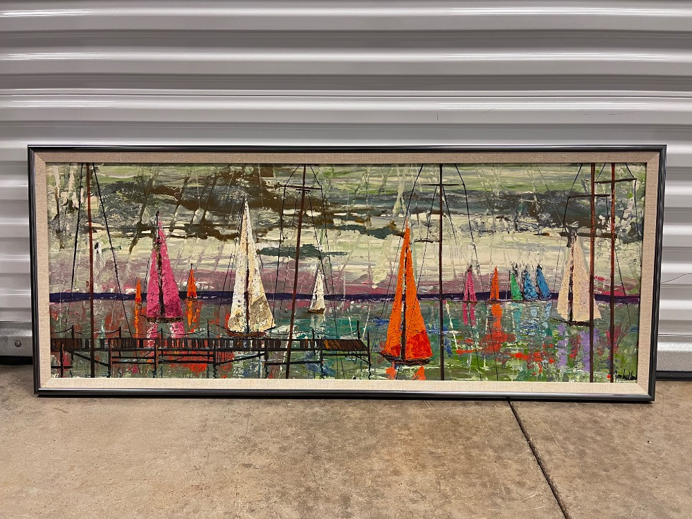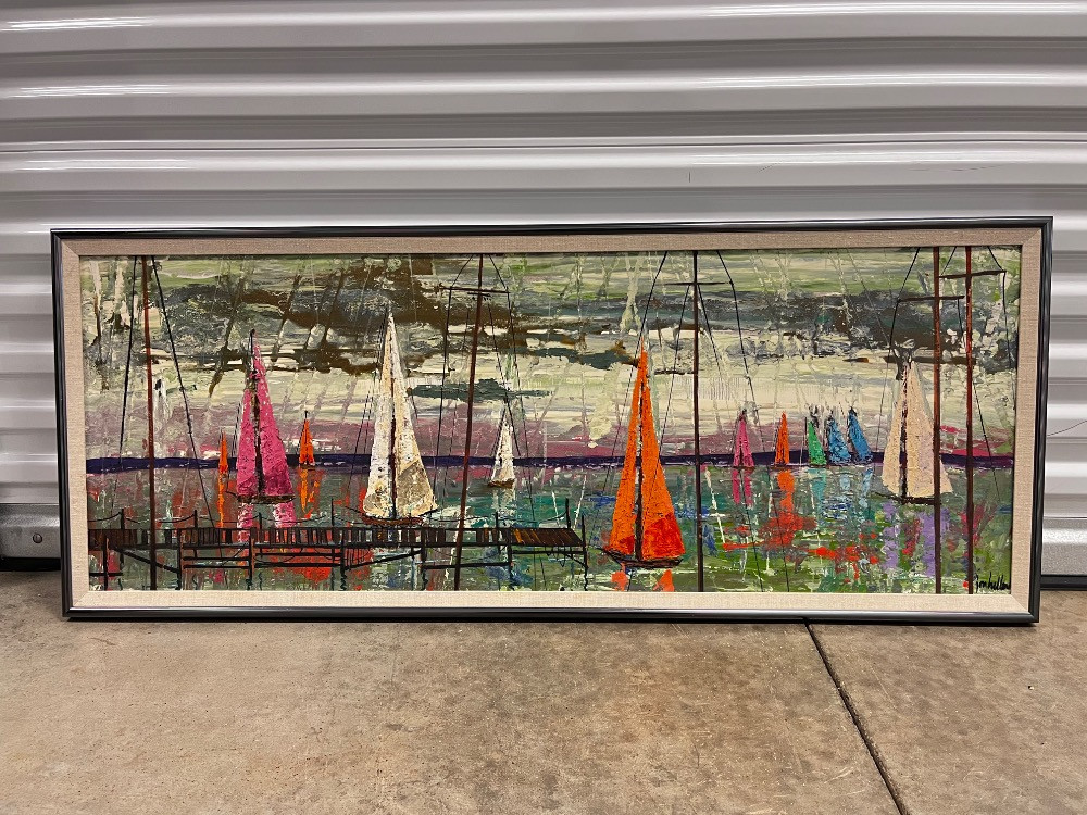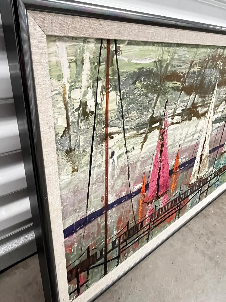 Lot # 128 - Vintage MCM Harbor Scene – Large Acrylic Painting on Canvas – Signed