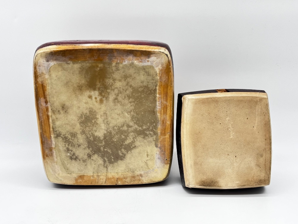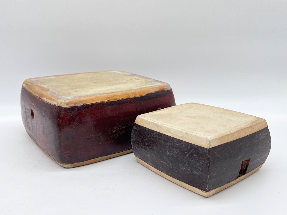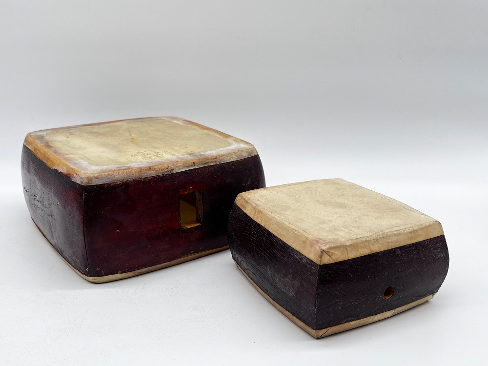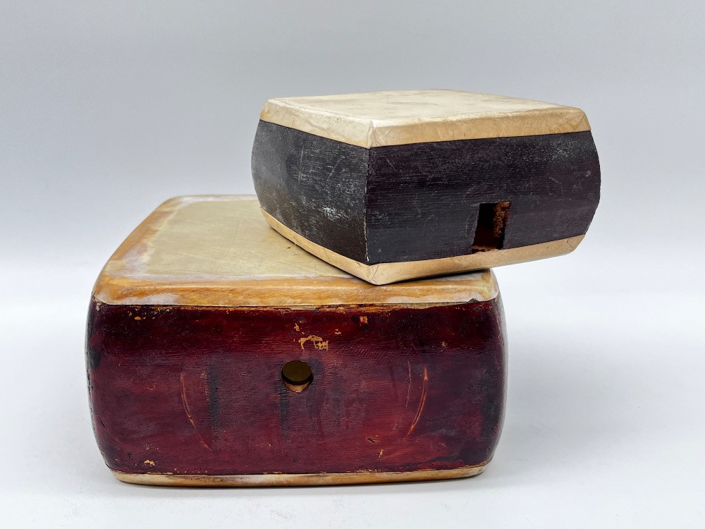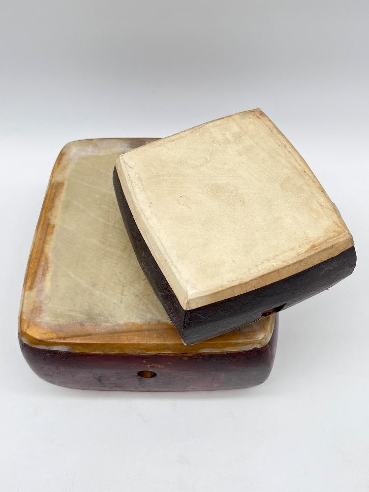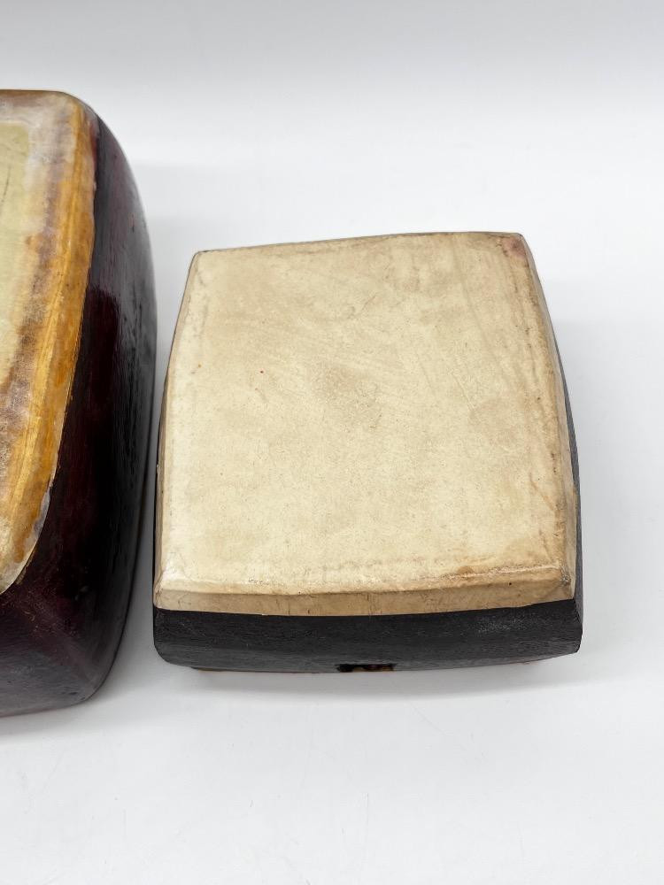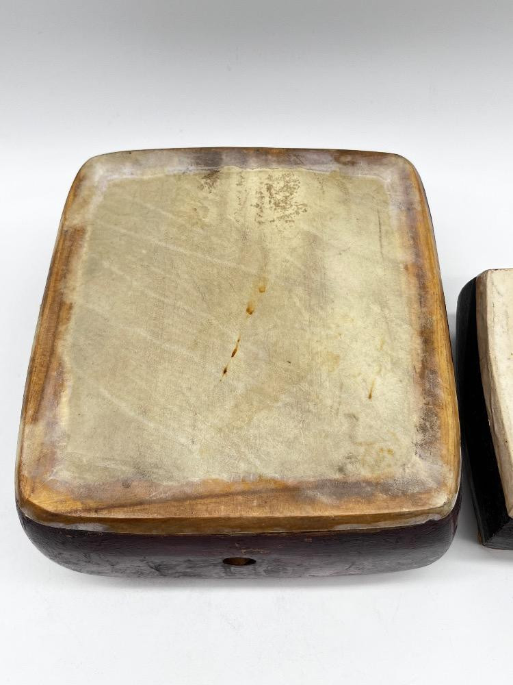 Pair of Handcrafted Wooden Percussion/Snare Drums – Leather & Wood. Big 7 1/2" L x 7" W x 4" H