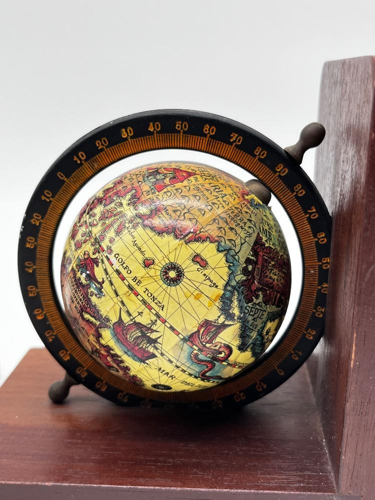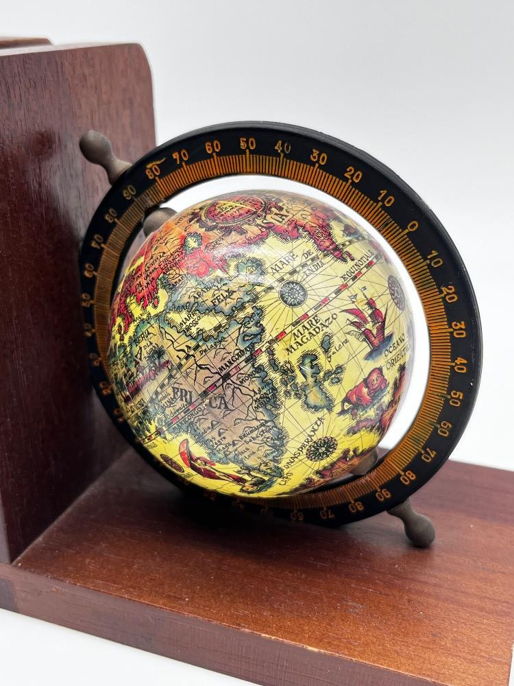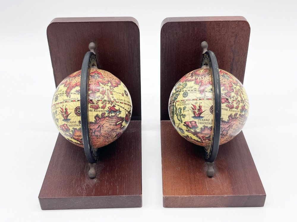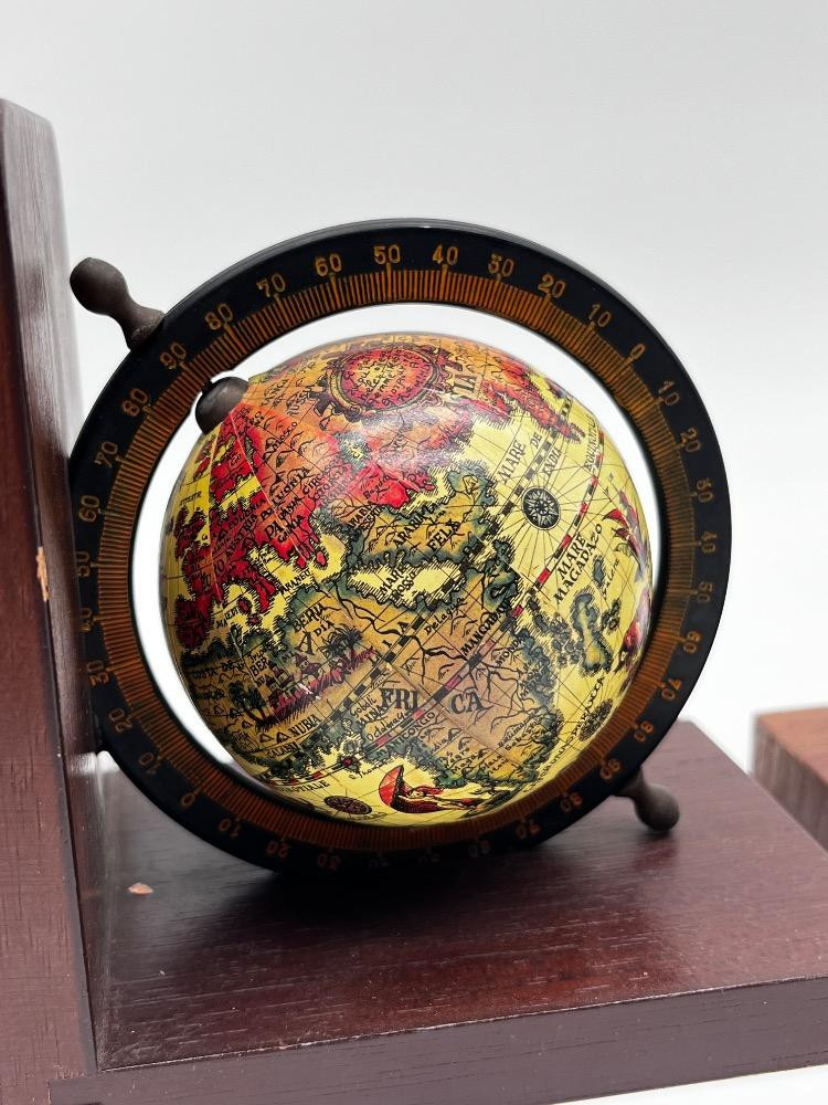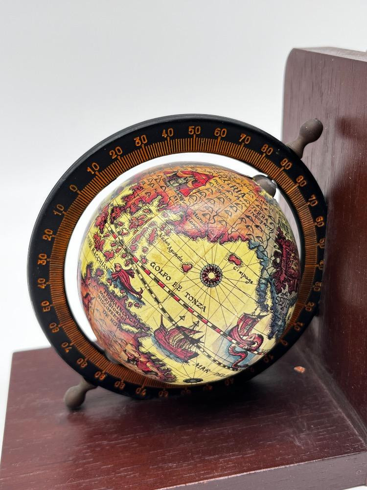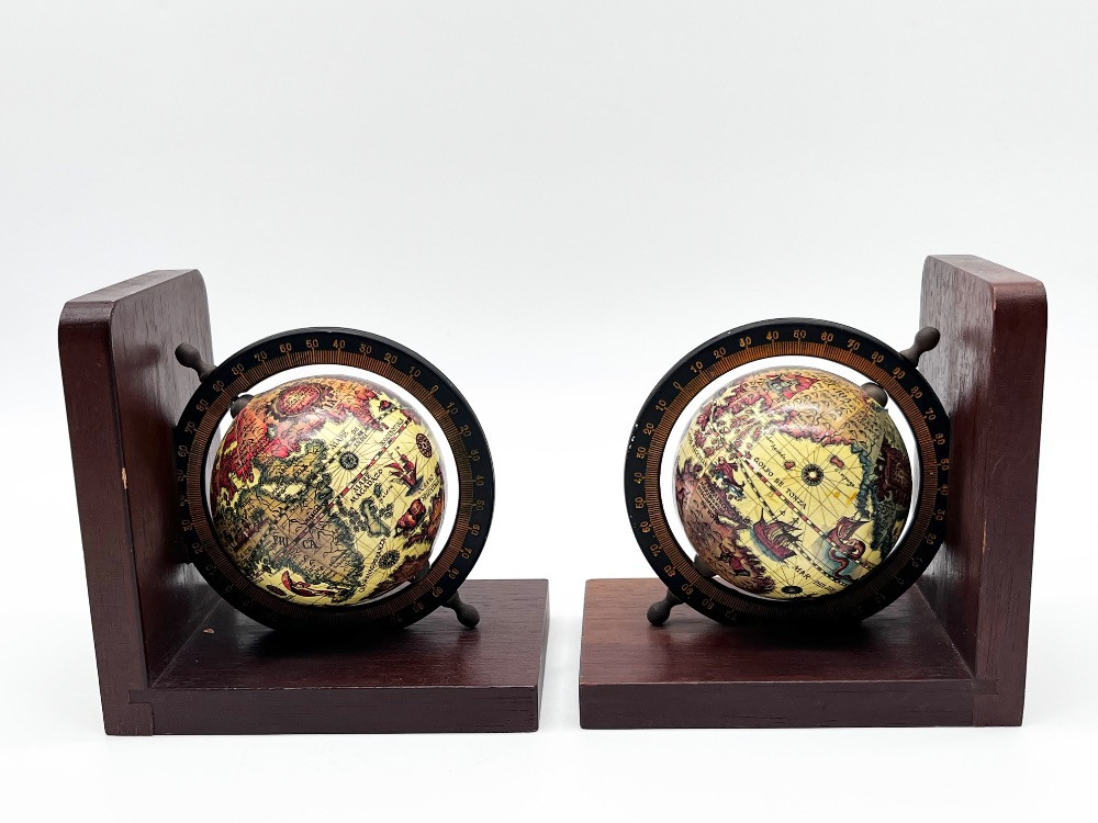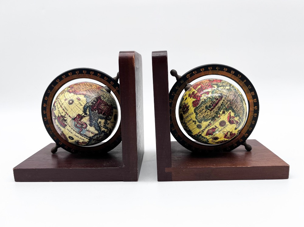 Vintage Style Old World Globe Bookends – Wooden Base, Antique Design. 5" H x 5'' W
