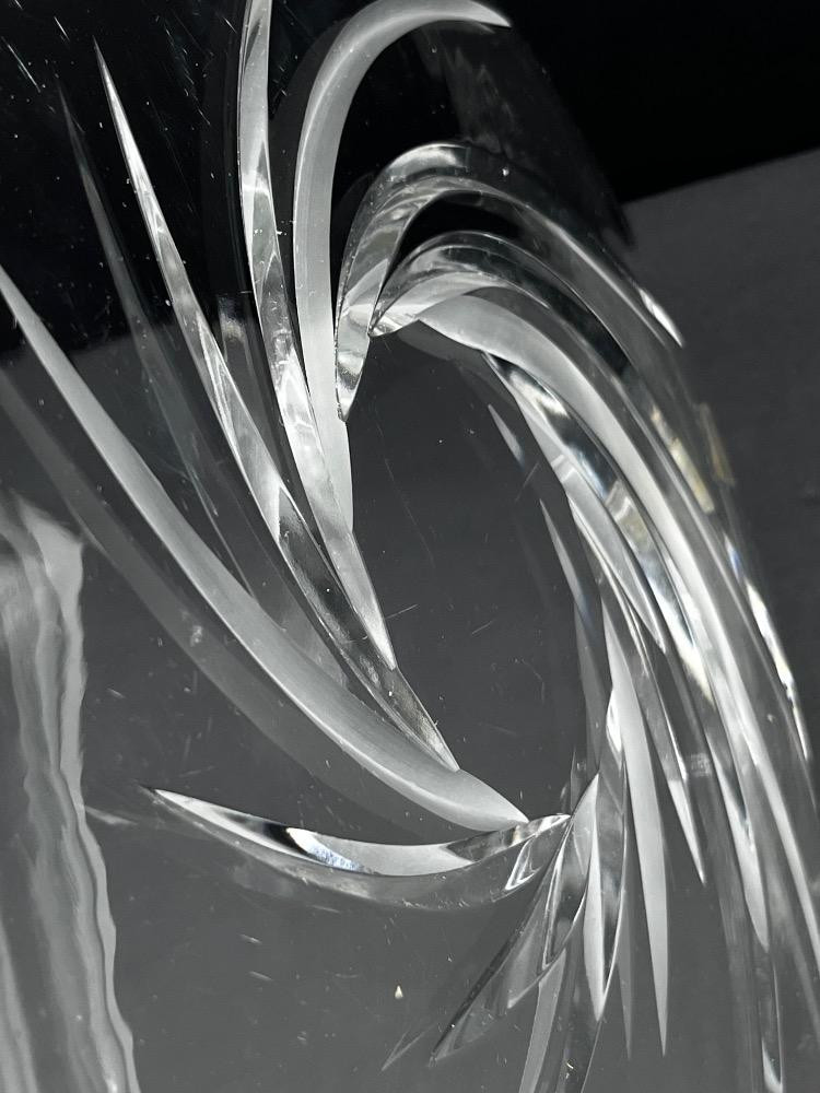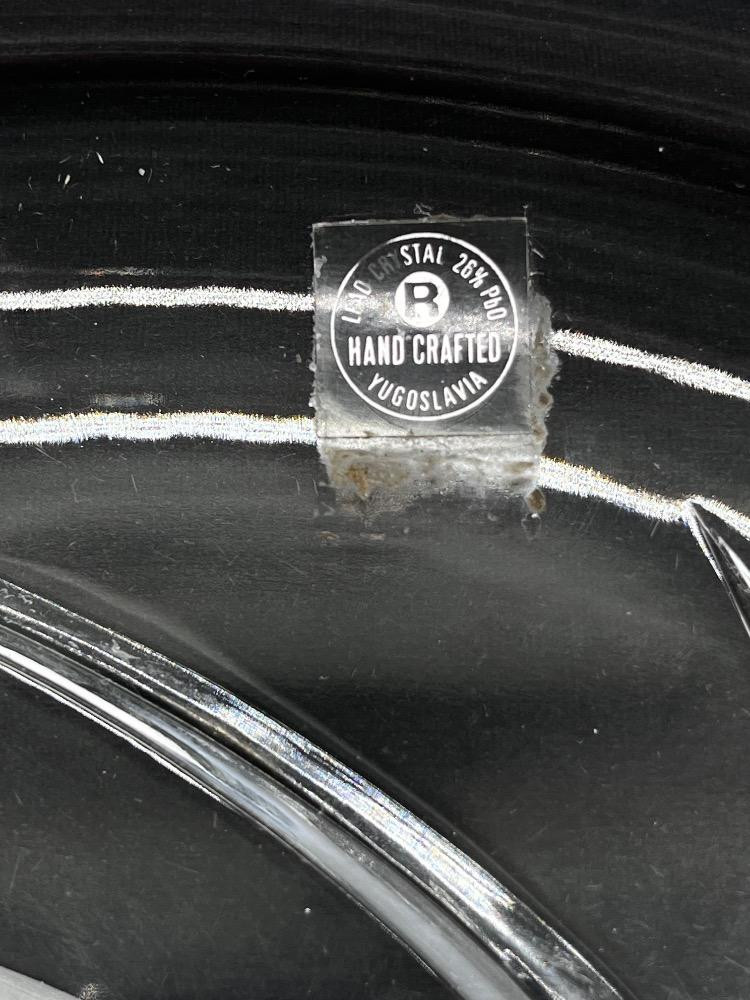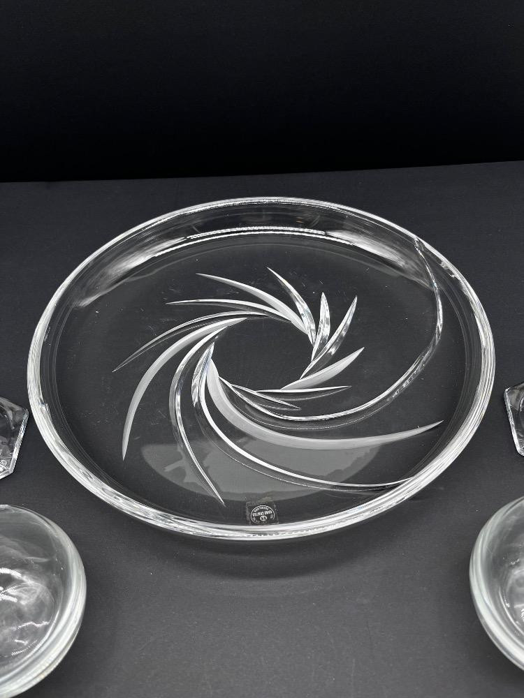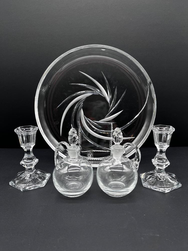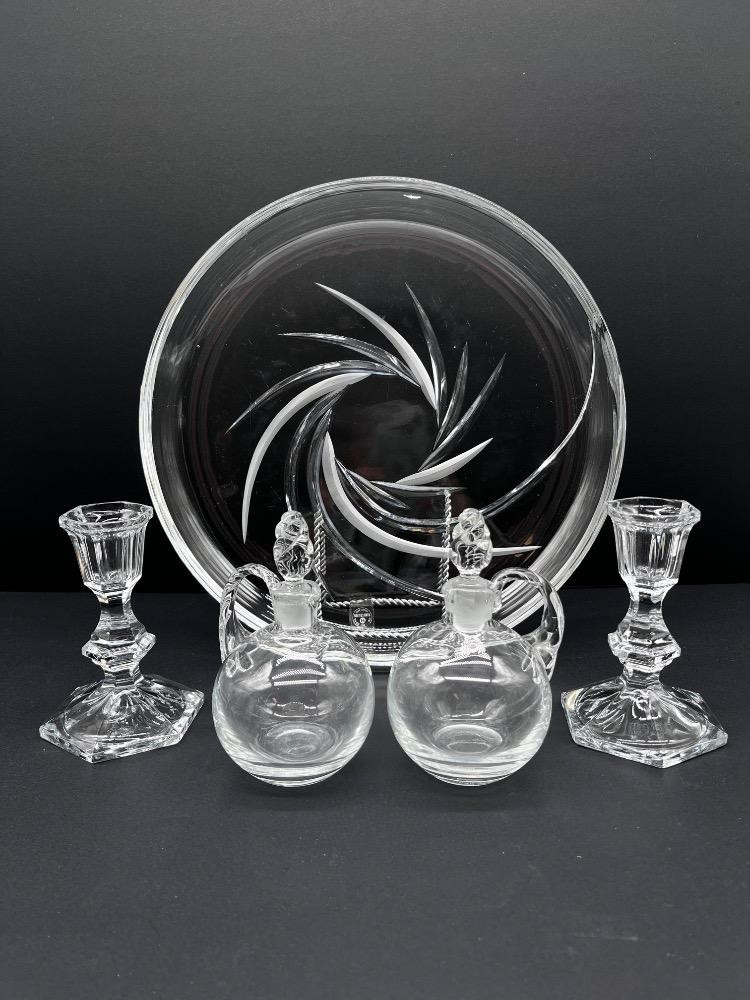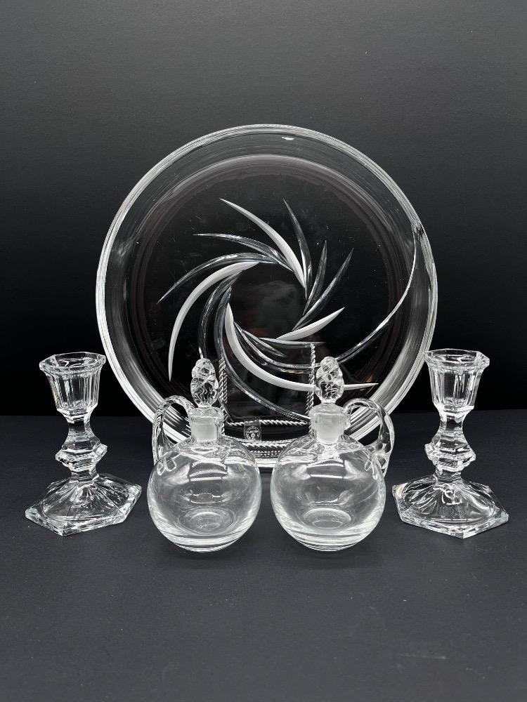 Yugoslavian Lead Crystal Plate, Candlesticks, & Cruets w/ Rose Stopper. Vintage Lead Crystal Serving Plate w/ Elegant Swirl Design - Yugoslavia - 12" Wide