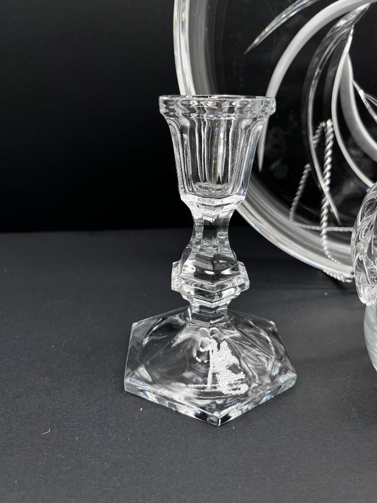 Lot # 158 - Yugoslavian Lead Crystal Plate, Candlesticks, & Cruets w/ Rose Stopper