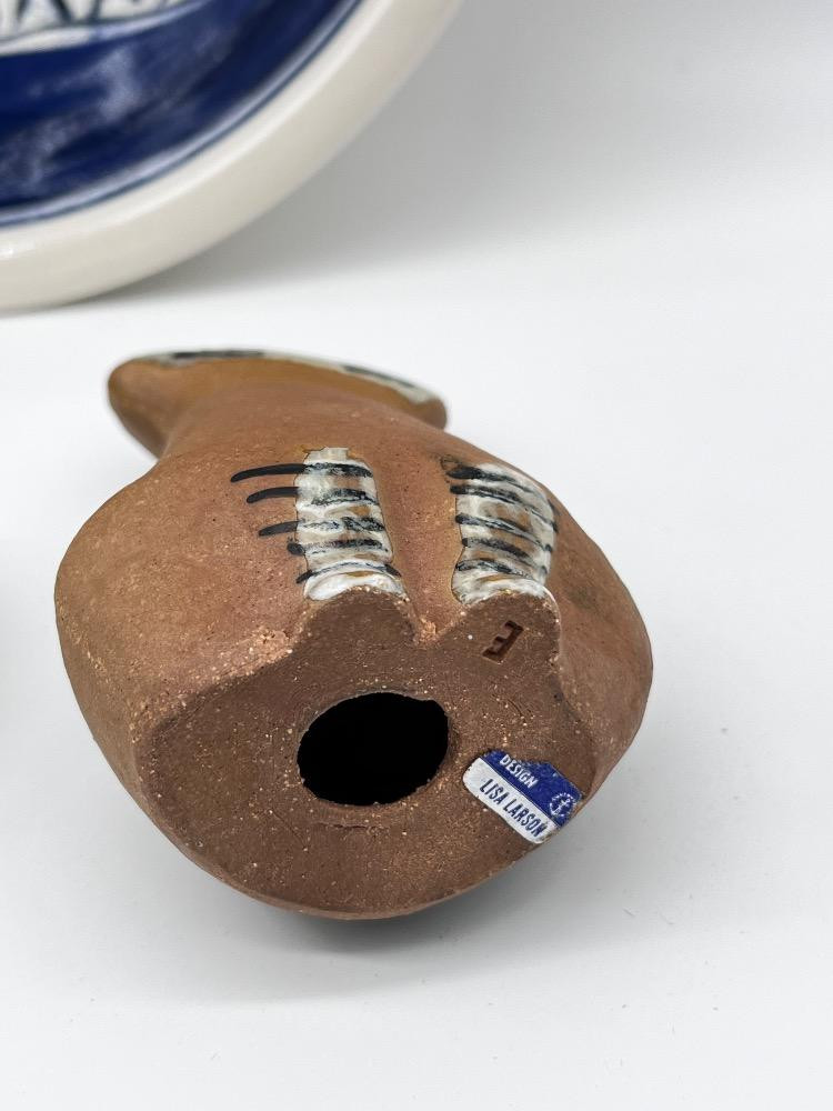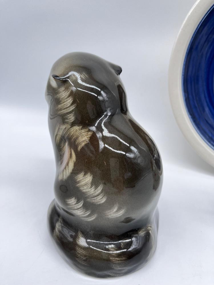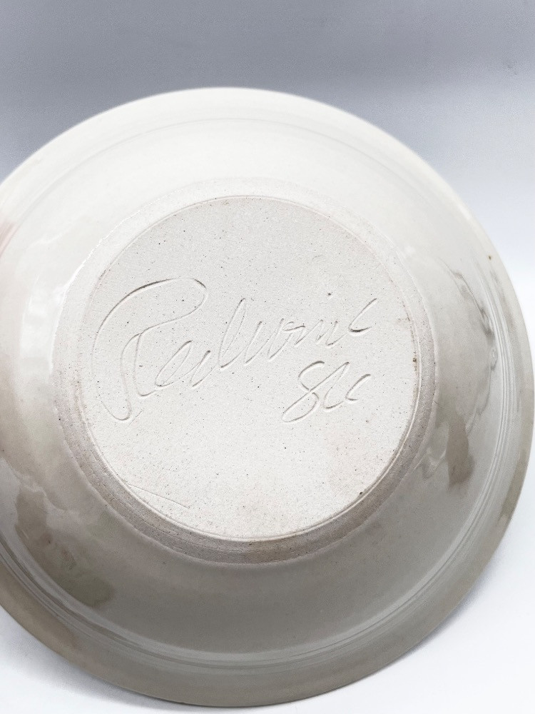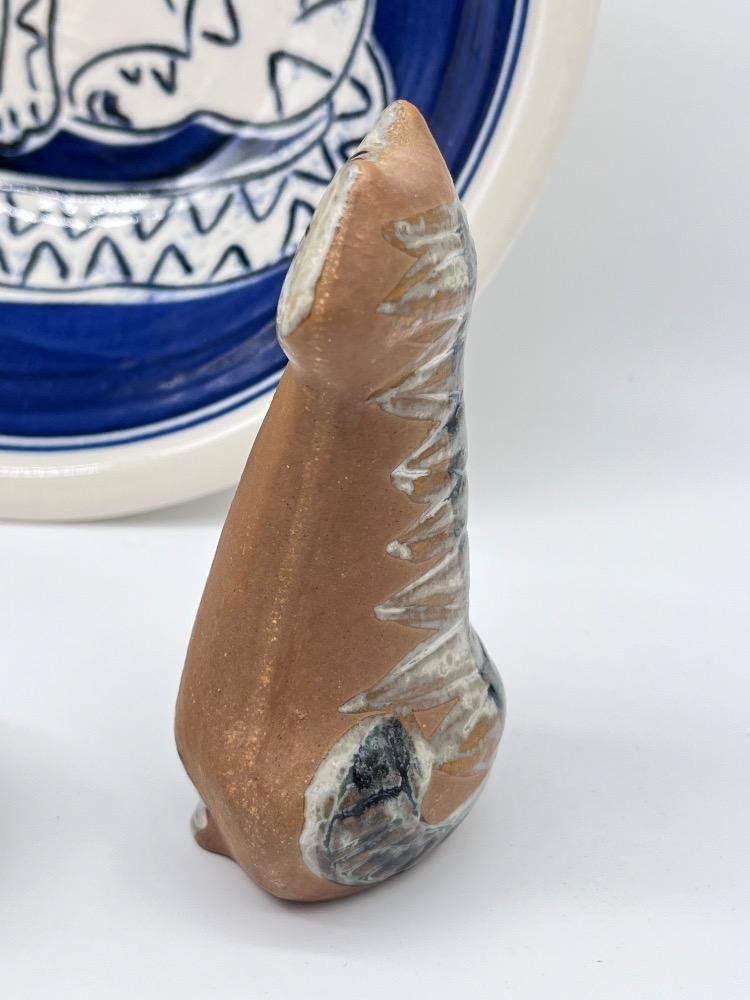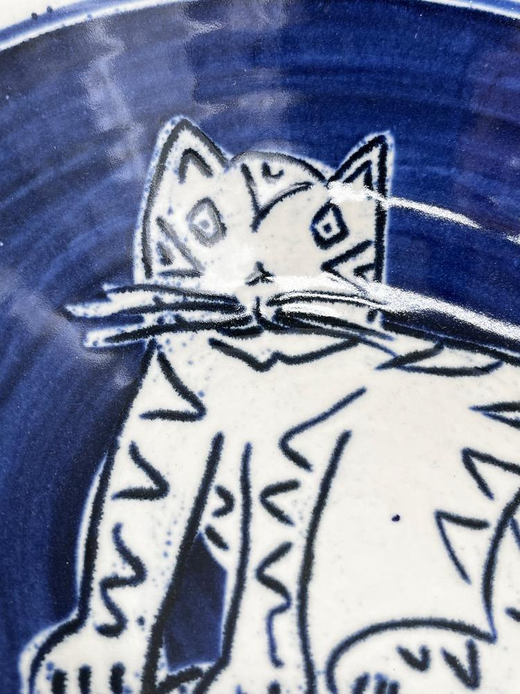 Signed Cat Collectibles – Lisa Larson, Elizabeth Arden, & More. Vintage Signed Studio Pottery Bowl – Blue & White Cat Motif - 10 1/4" W x 2 1/2 H